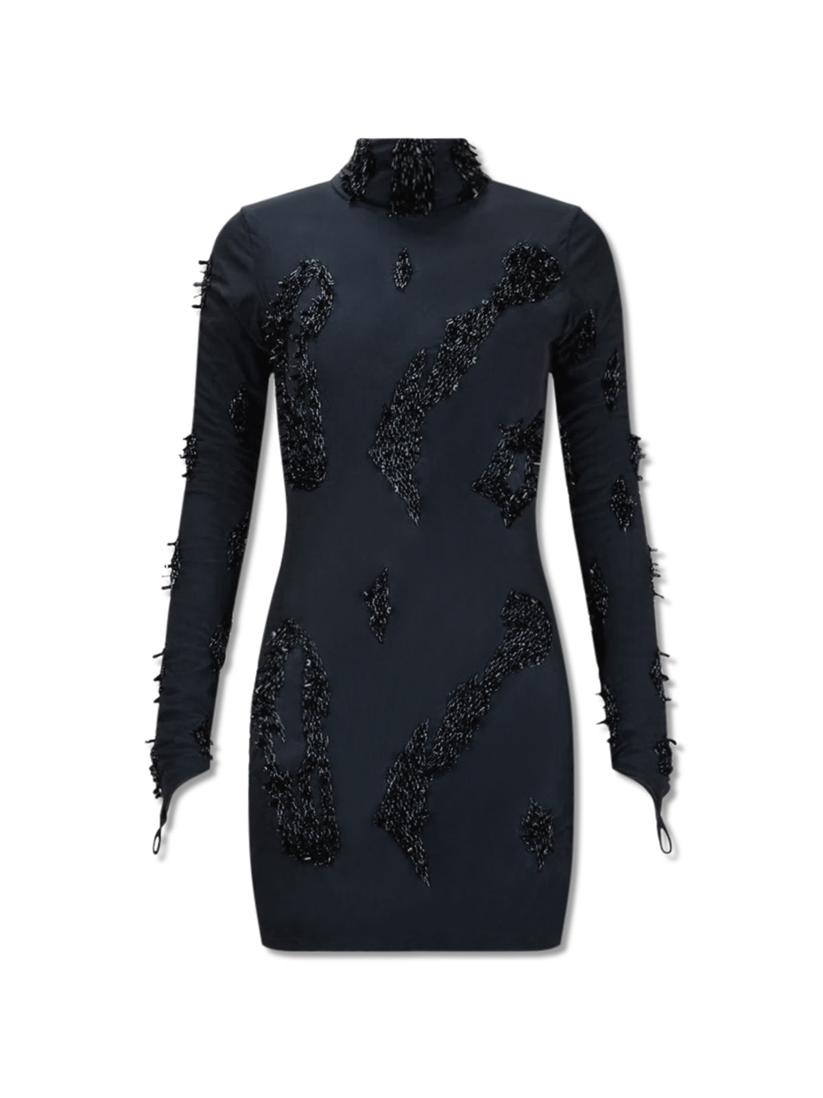 Onalaja describe their Zusi Mini dress as a 'stunning masterpiece'. Crafted from stretch mesh, it features intricate, hand-beaded detailing arranged in clusters—a testament to the exceptional craftsmanship the Nigerian label is celebrated for. The style has a form-fitting silhouette with a high neck and arm-lengthening finger loops. Style yours with sheer tights and maxi accessories.