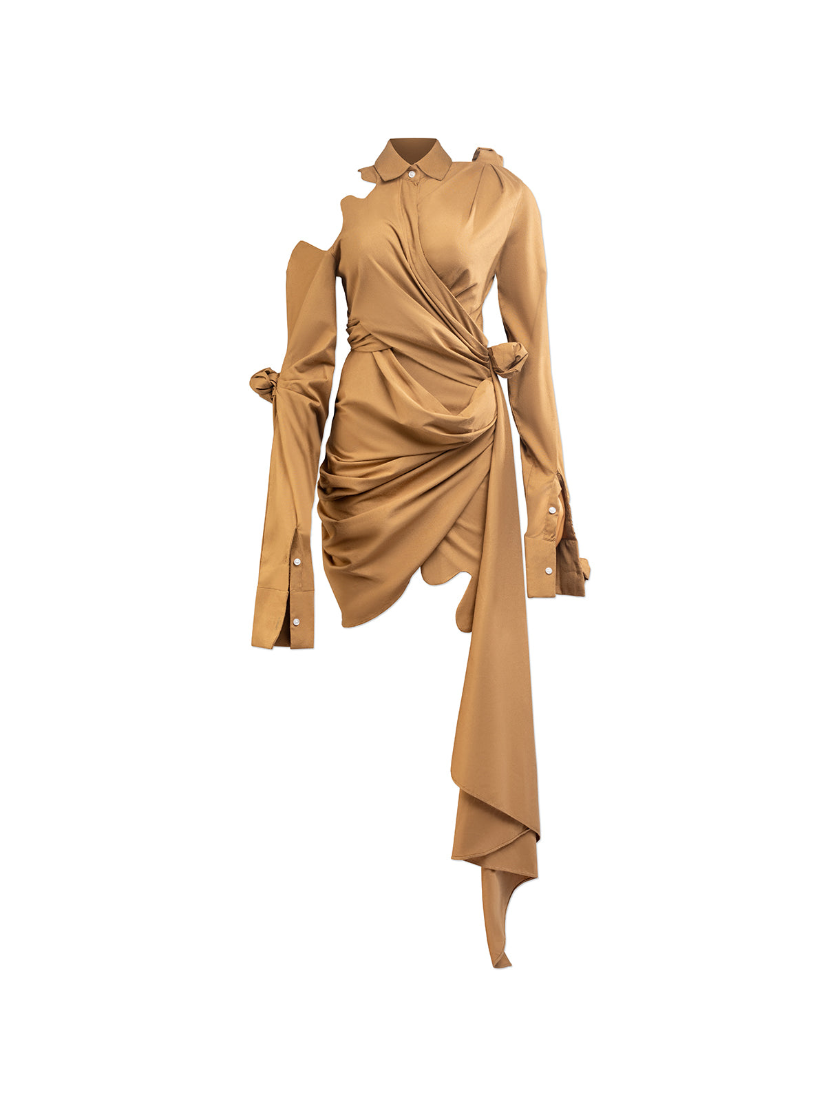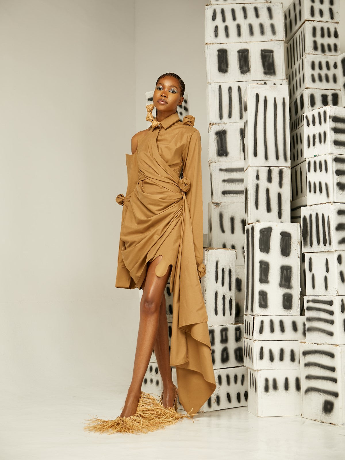 The Ibeji collection by Nigerian label Fruché draws inspiration from the designer’s personal experience—growing up in Lagos with his twin brother. Utilizing fabric to create a sculptural effect, this Onyisi Shirt Dress has been draped by hand and finished with playful knots and cutouts. The fitted silhouette falls to an asymmetric mini hem, letting your shoes take center stage.