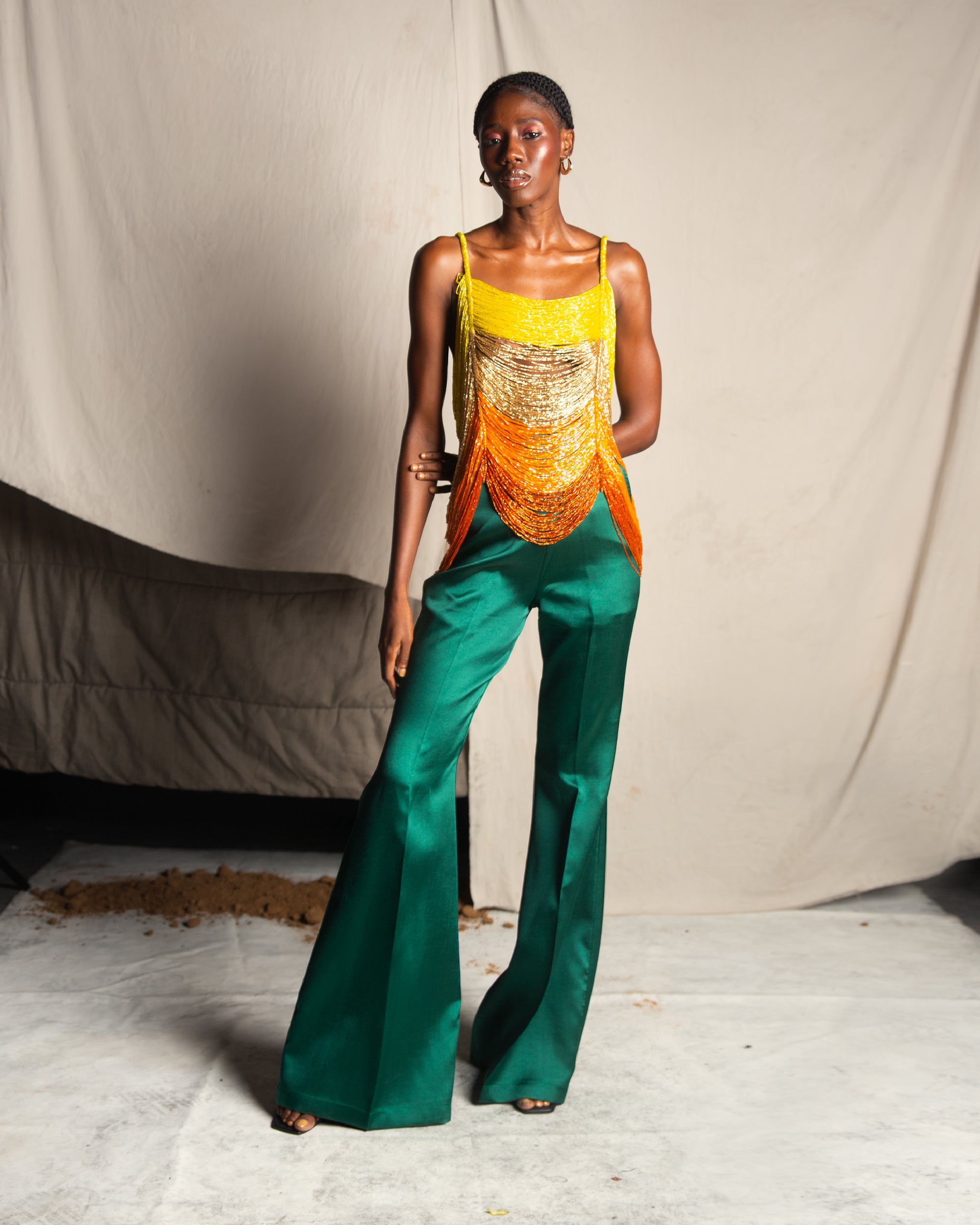 With their vibrant green hue and beautiful luster, these Amaka Pants perfectly capture Orange Culture's creative spirit. They're made in Lagos and tailored to a retro-inspired silhouette that fits slim through the hips and thighs before flaring out from the knees to the cuffs. Style them with a minimalist Bayo Top and strappy heels for an effortless after-dark look.