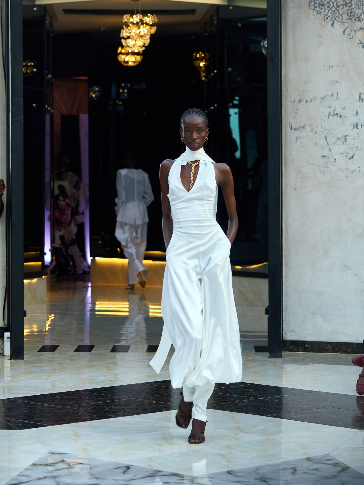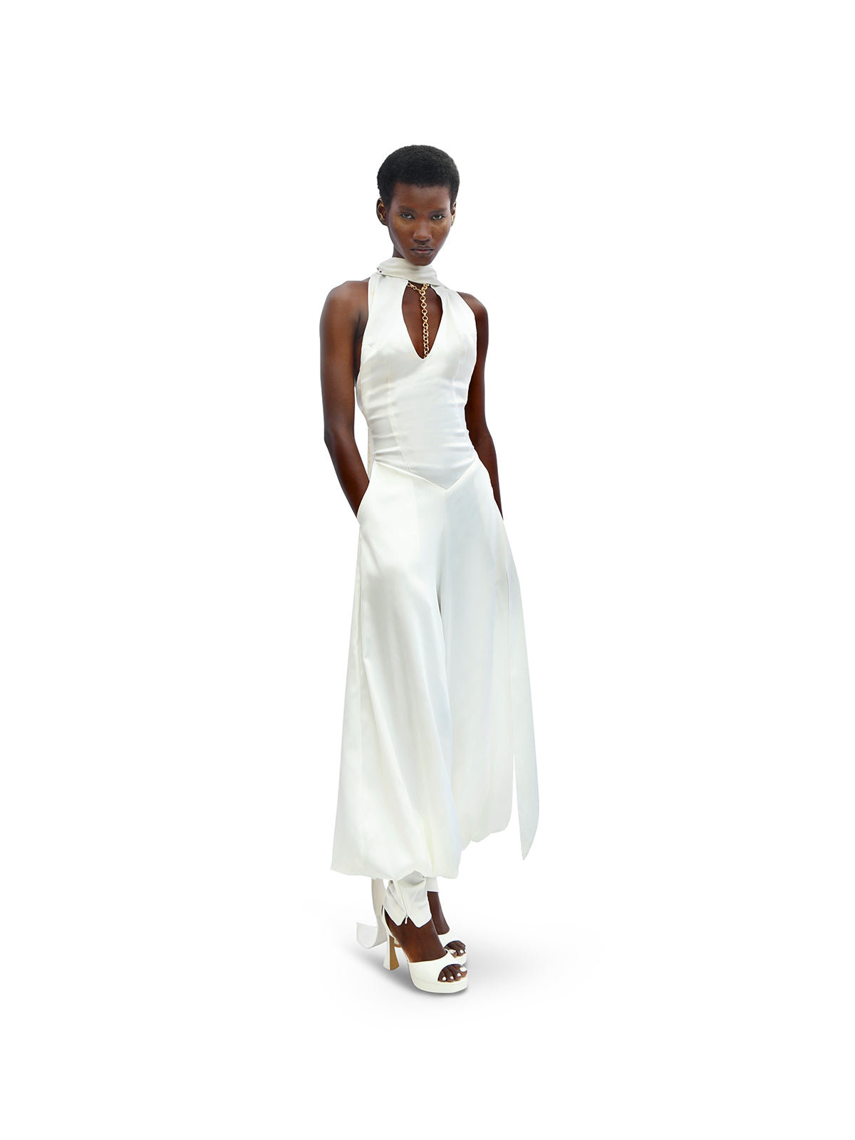 - Relaxed silhouette, halter neck with harem-inspired leg