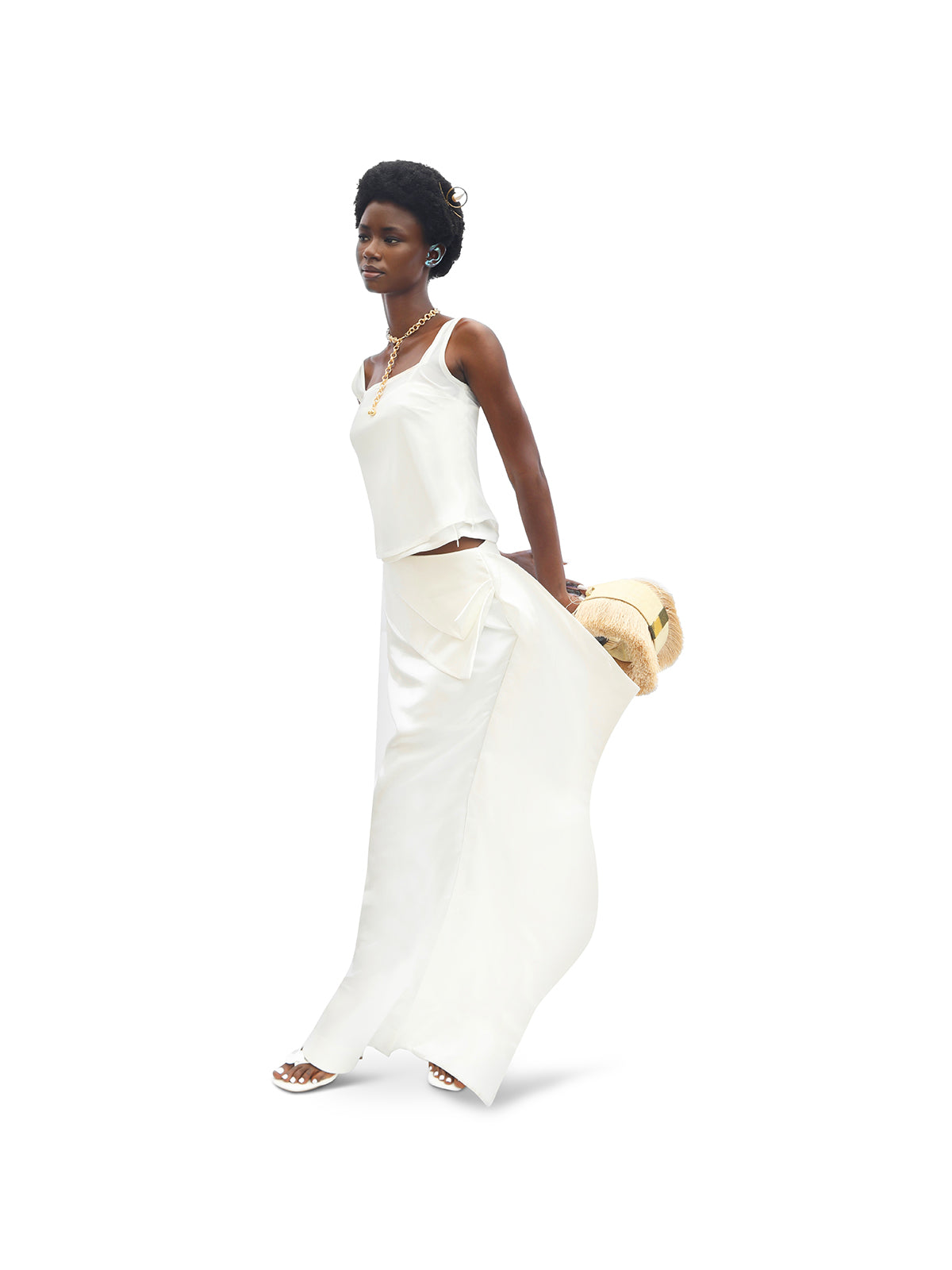 Orange Culture’s Spirit Skirt floats between strength and softness, with its sinuous silk panels cut to trace the body in quiet rhythm. Designed to move like a whisper, it transforms each step into a gesture of grace. Wear with a fitted tank or silk shirt to balance texture and flow.
