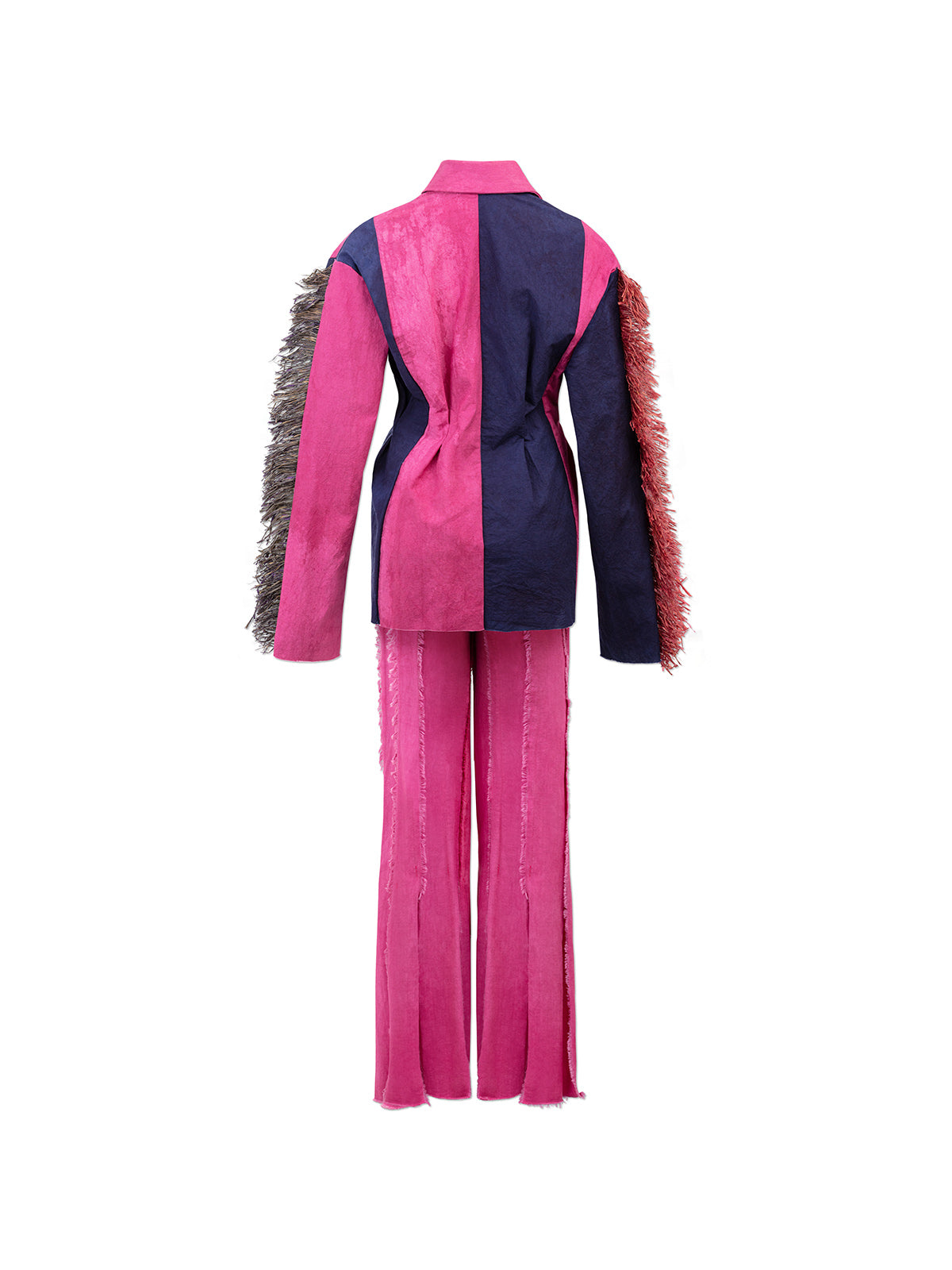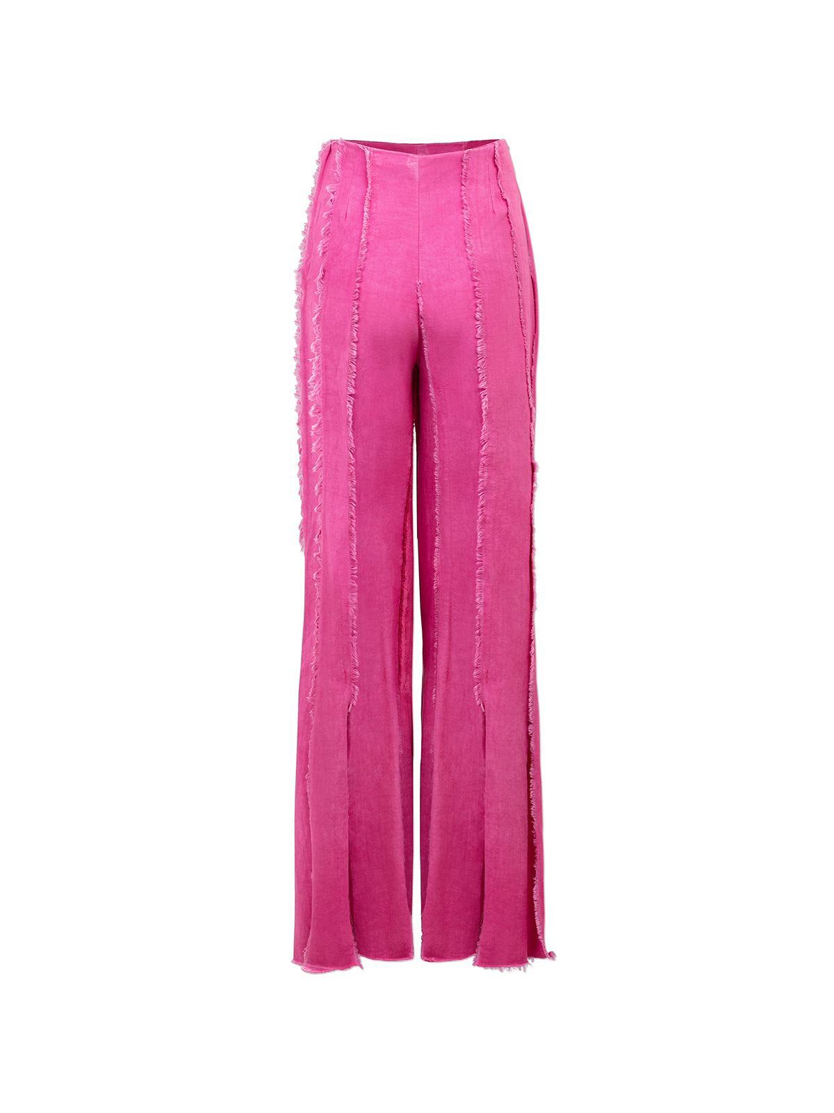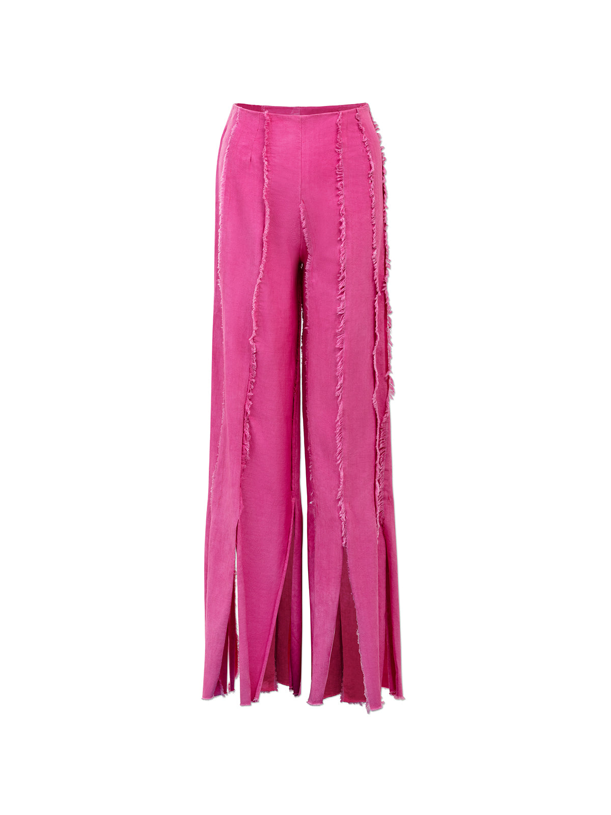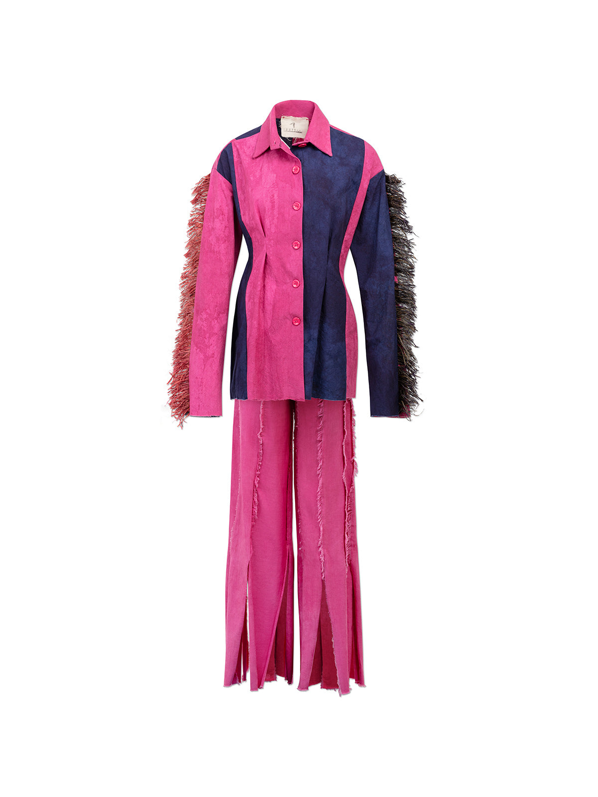 The sweeping fuschia Paneled Pants from IAMISIGO are hand-crafted by artisans in Nairobi using recycled cotton panels. Featuring long slits at the hem with raw-edge detailing—these trousers look best styled with a simple shirt and a statement shoe, or wear with the coordinating Panelled Shirt Dress to stand out in the crowd.