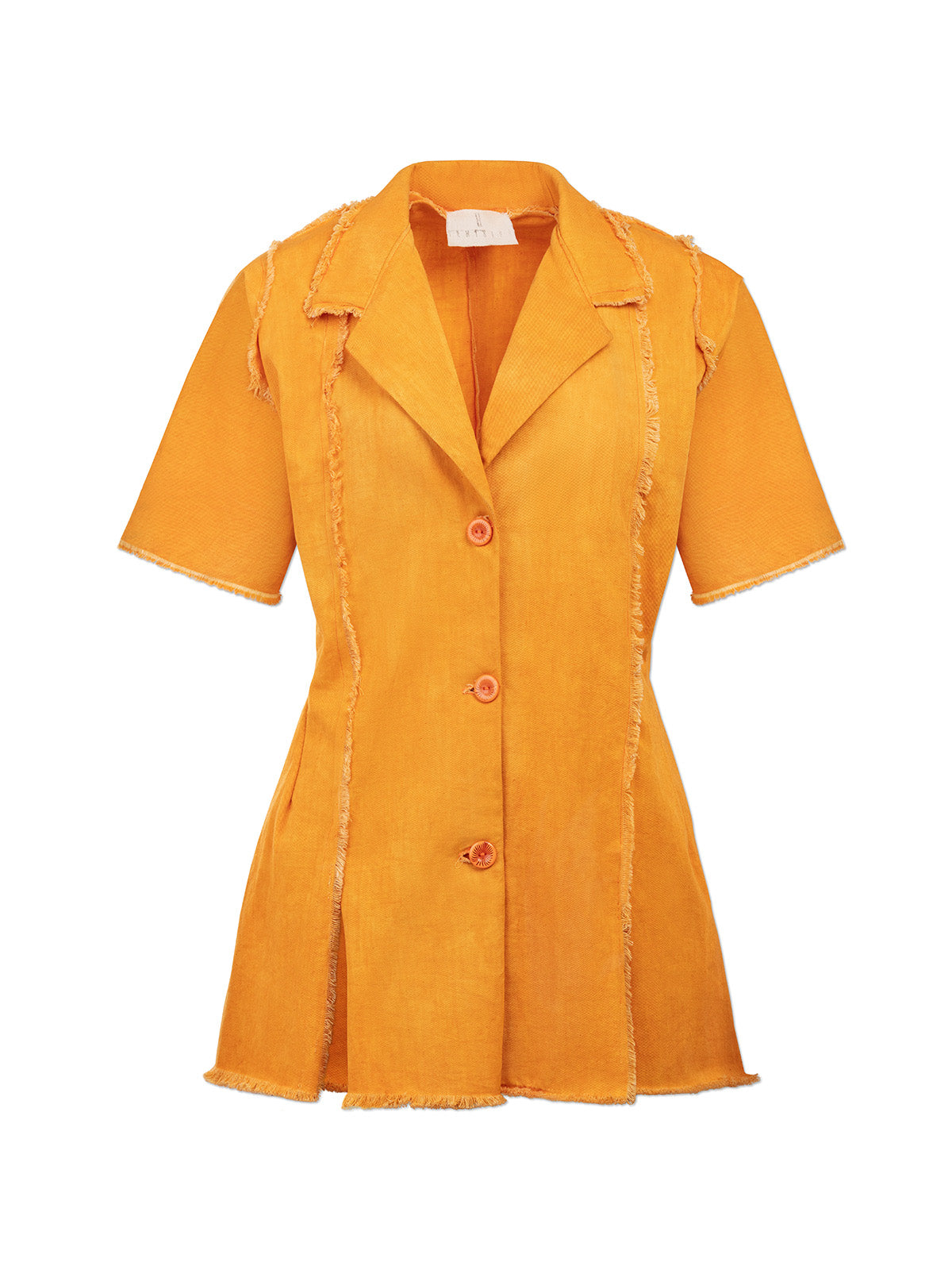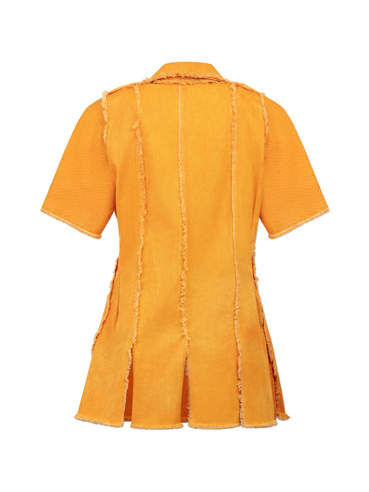 - Paneled construction, notch lapels, button fastening, front and back slits, frayed detailing