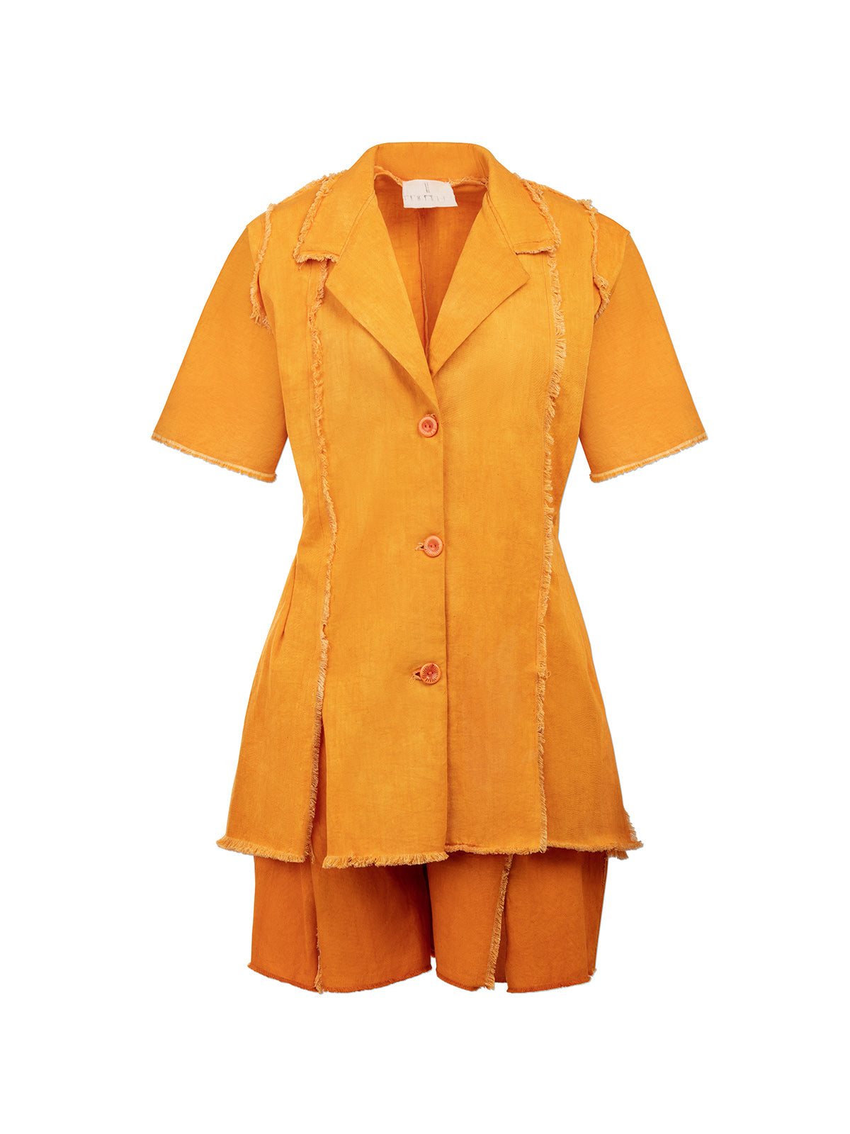 Lightweight enough for the warmer weather, this Paneled Short-Sleeve Overshirt by IAMISIGO will look equally good with the matching shorts and over feminine dresses. It’s been crafted in Kenya from upcycled cotton twill and dyed using organic ingredients to create a bright orange hue. The frayed detailing and playful slits at the hem enhance the label’s modern bohemian aesthetic. Offset the vivid shade with subtle neutrals.