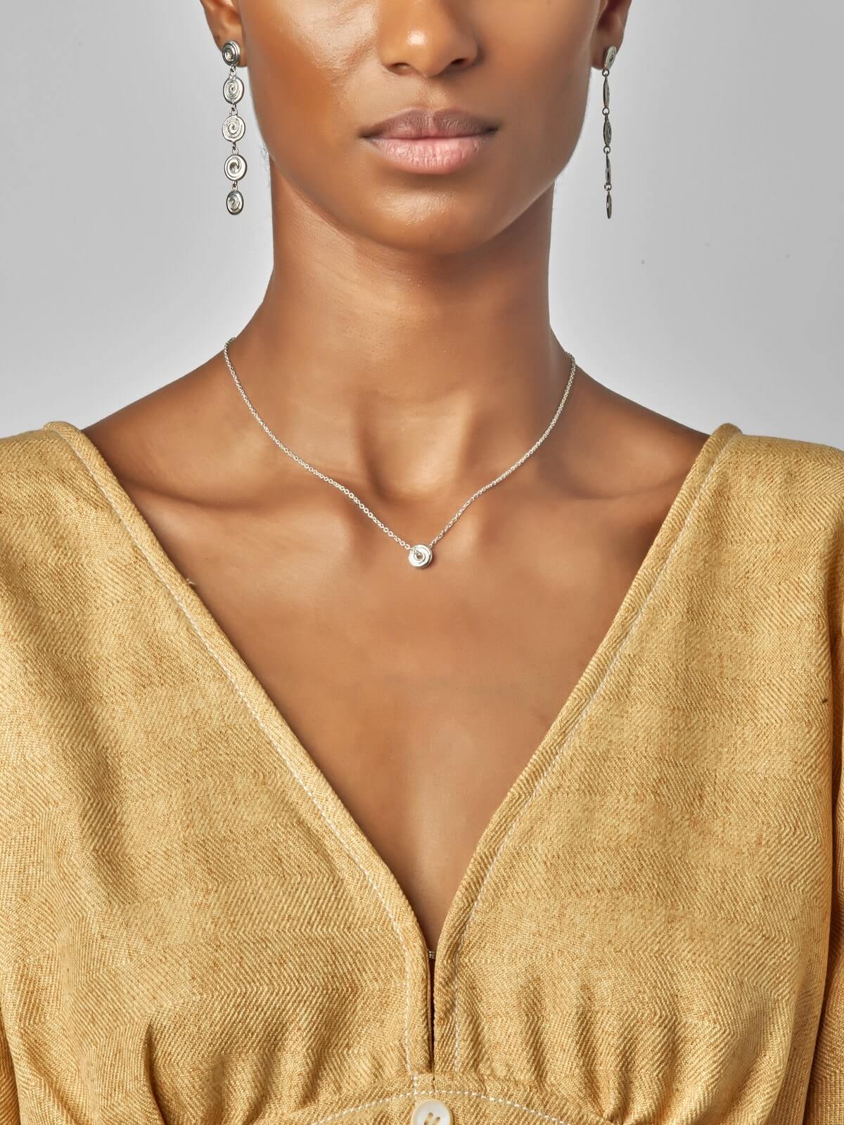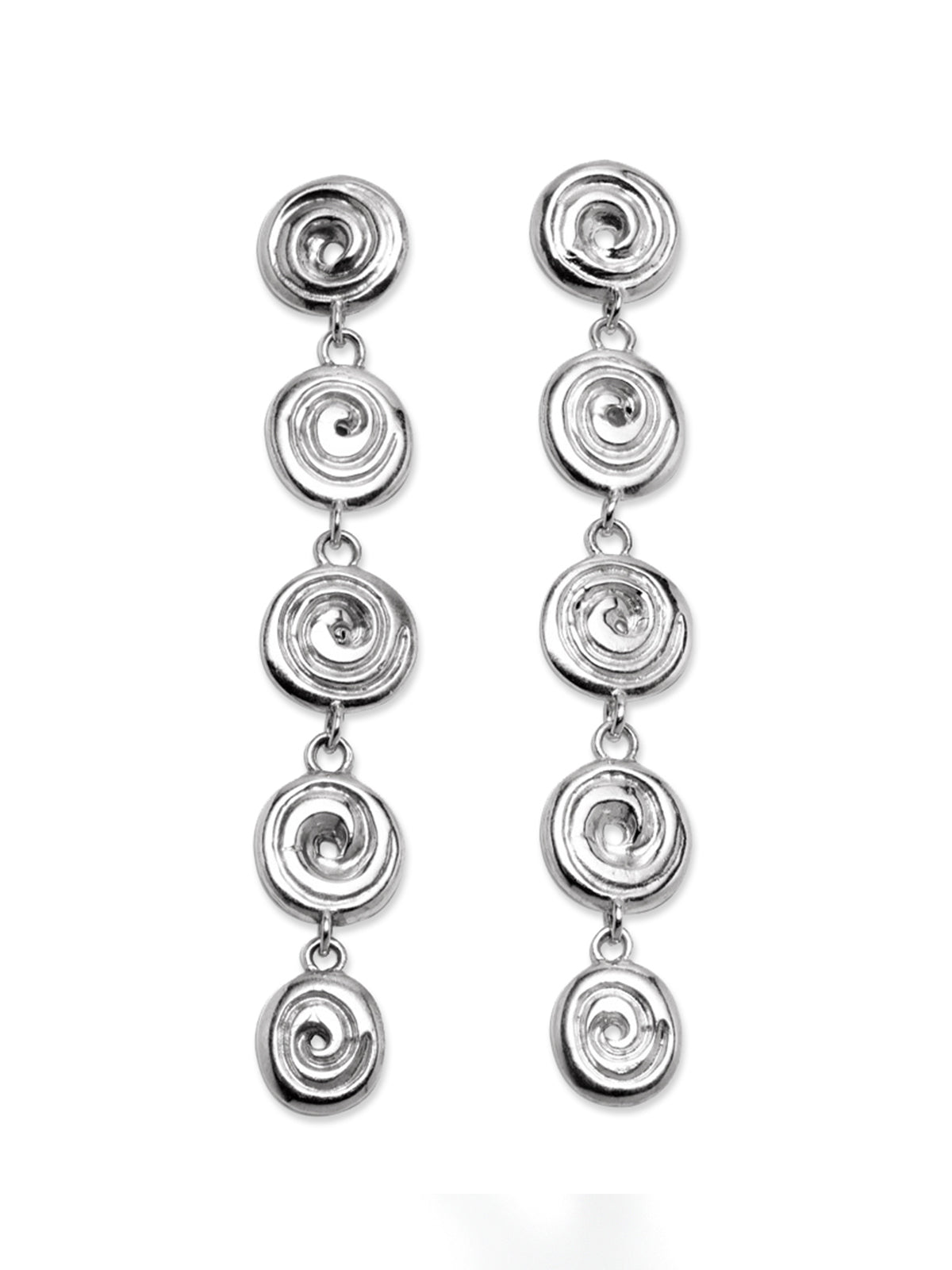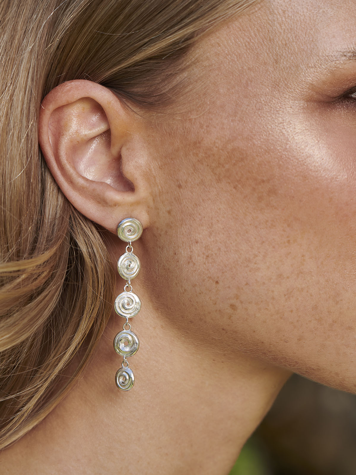 Five sterling silver Ndoro shells are linked together to create an elegant graduated effect, which catches the light at all angles. Wear your hair swept back, and let them hang gracefully above a day to night ensemble.