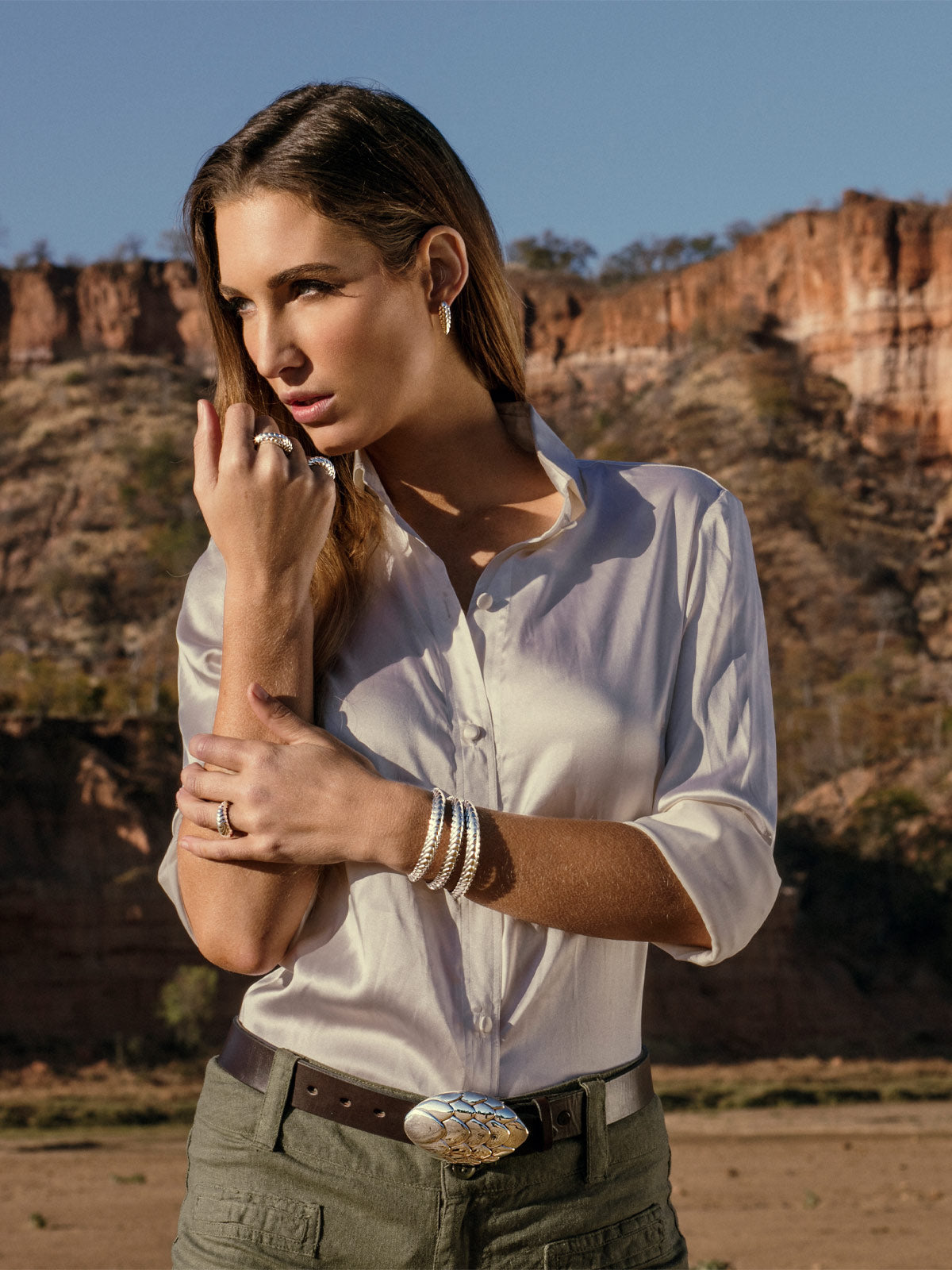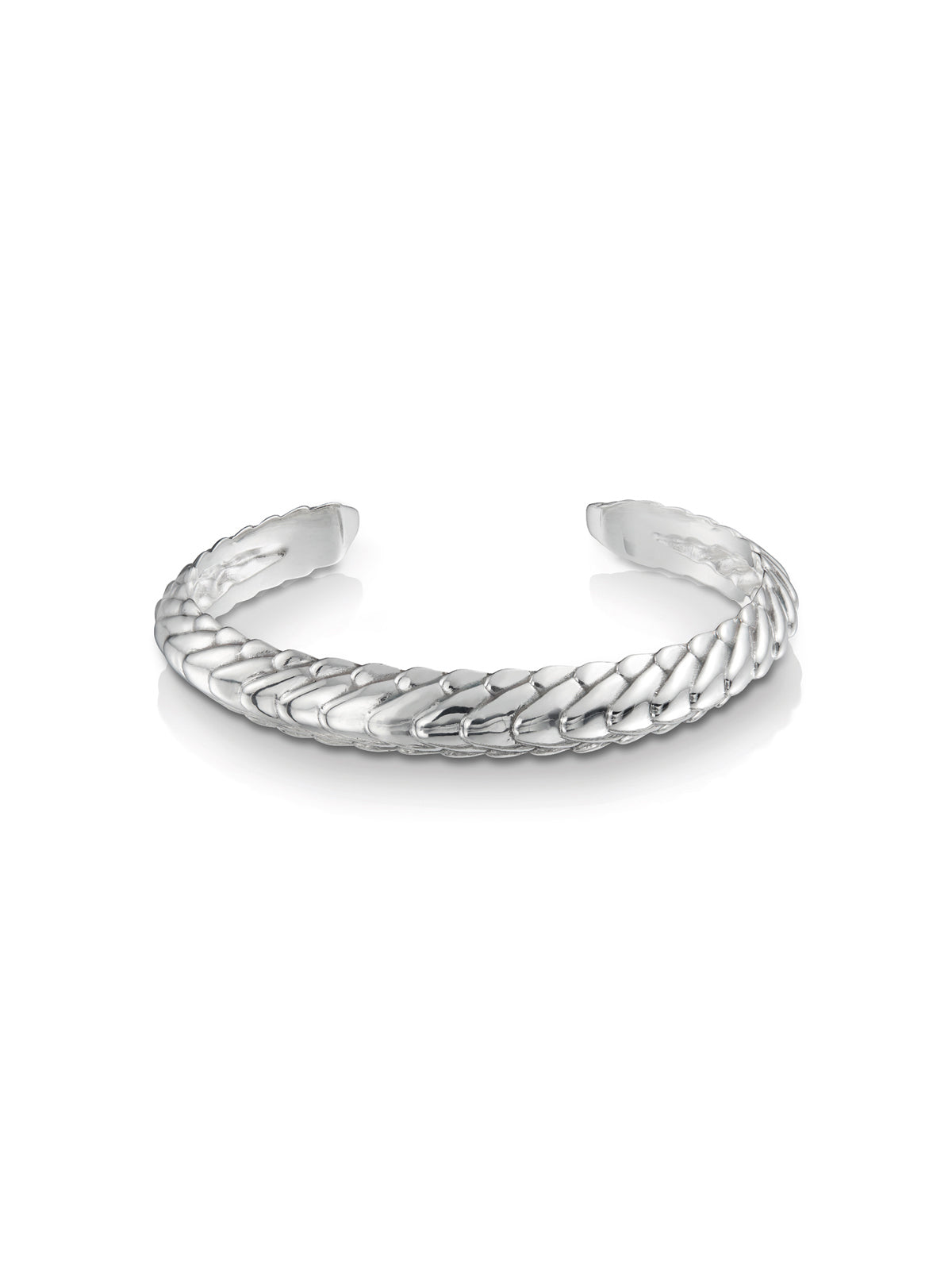 The family behind Zimbabwean brand, Patrick Mavros, continue to pay tribute to sub-Saharan animals throughout their collection; this time with the distinctive Pangolin Stacking Cuff. Handmade in Mauritius from recycled sterling silver, the texture of this elegant wristpiece resembles the pangolin mammal's intricate scales. Wear individually or try stacking with multiple cuffs for a stand-out result.