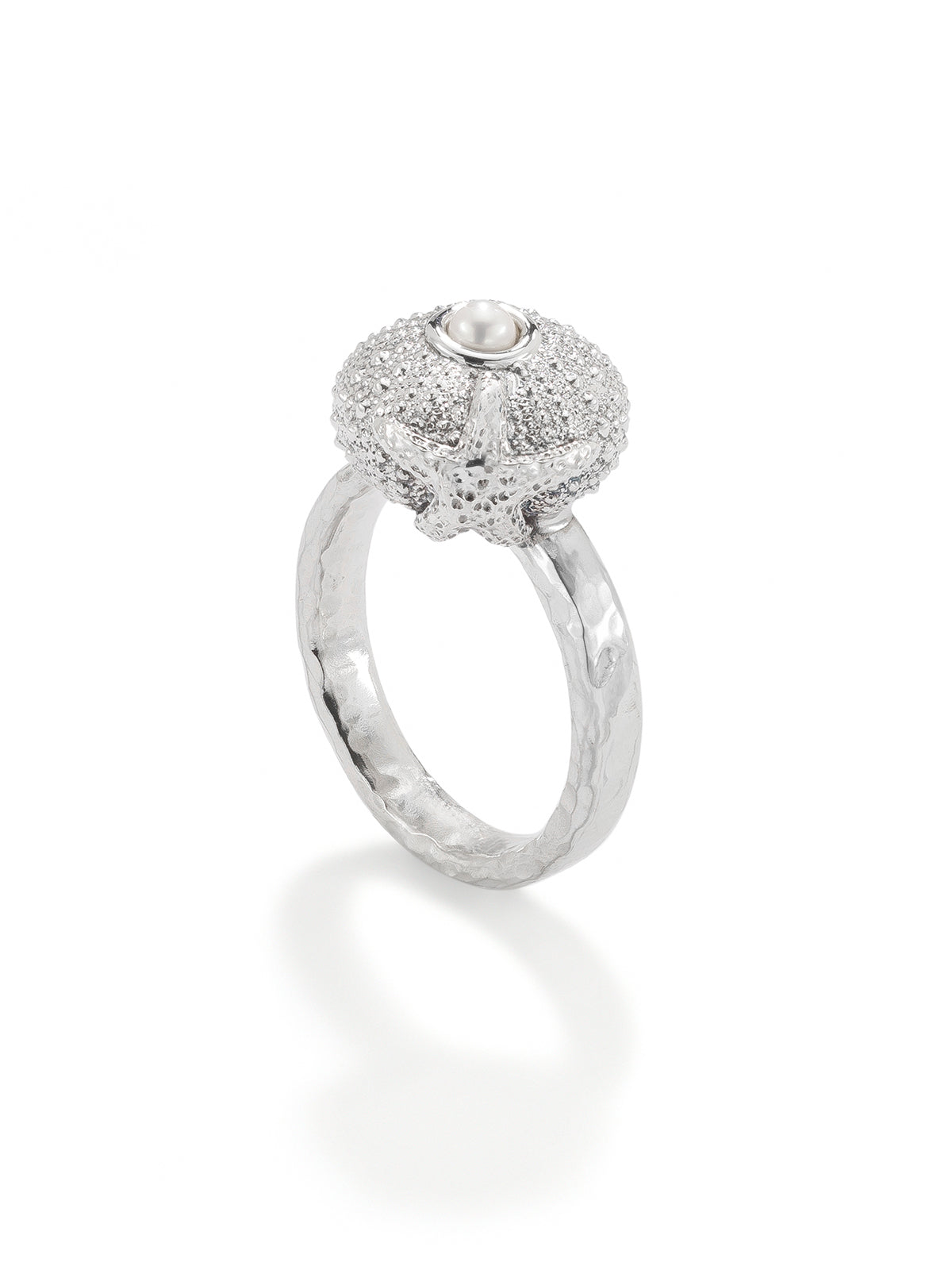 id !== 1) : openAccordions.push(1)"> Insider NotesFor Patrick Mavros' underwater themed collection, the brand celebrates the fascinating oceanic creatures found on the shores of Mauritius. The Sea Urchin Starfish Ring has been hammered by hand and features a single pearl embedded into a sterling silver sea urchin, while an intricate baby starfish clasps onto the side. Cast from actual sea specimens found by the Patrick Mavros team, this ring will provide yearlong wearing opportunities while reminding you of faraway, tropical destinations.