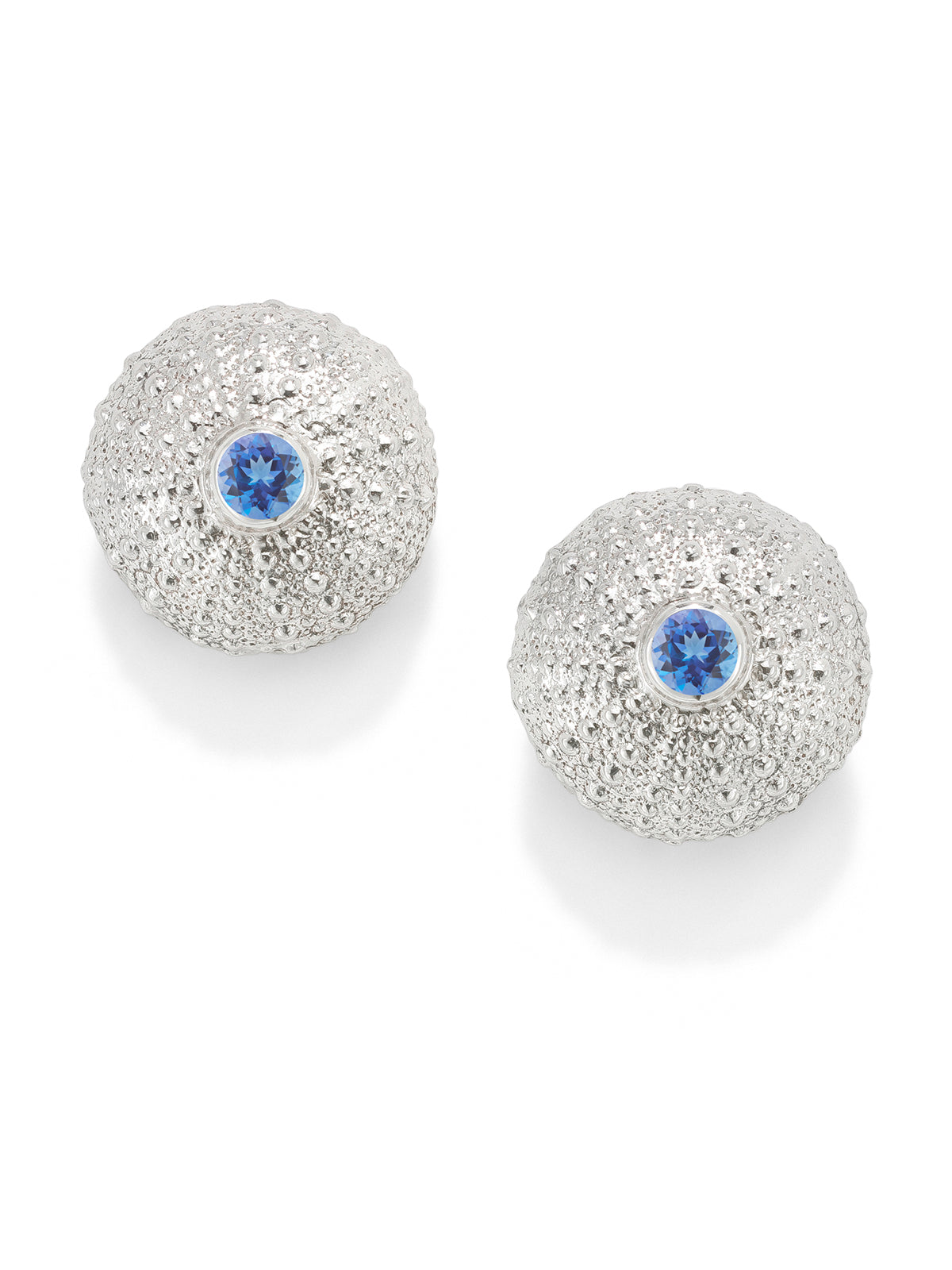 The delicate Sea Urchin Stud Earrings were hand-cast from a minute sea urchin—the smallest shell the Patrick Mavros team have ever found on the beach in Mauritius. Perfect for everyday wearing opportunities, this sterling silver design was finished with single blue tanzanite stone, reflecting the natural colors of the underwater creatures, and for that added touch of opulence the Zimbabwean brand has become much admired for.
