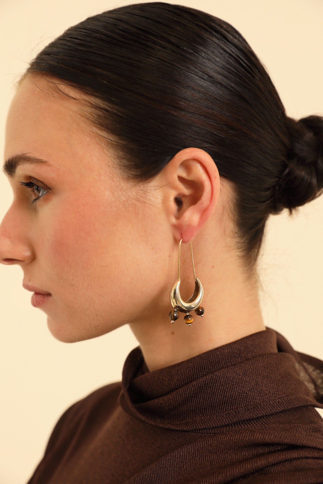 - Brass drop earrings with tiger’s eye stones