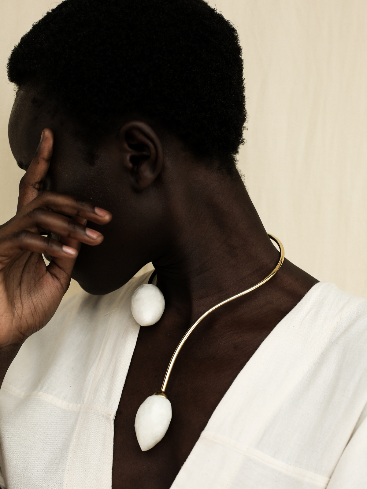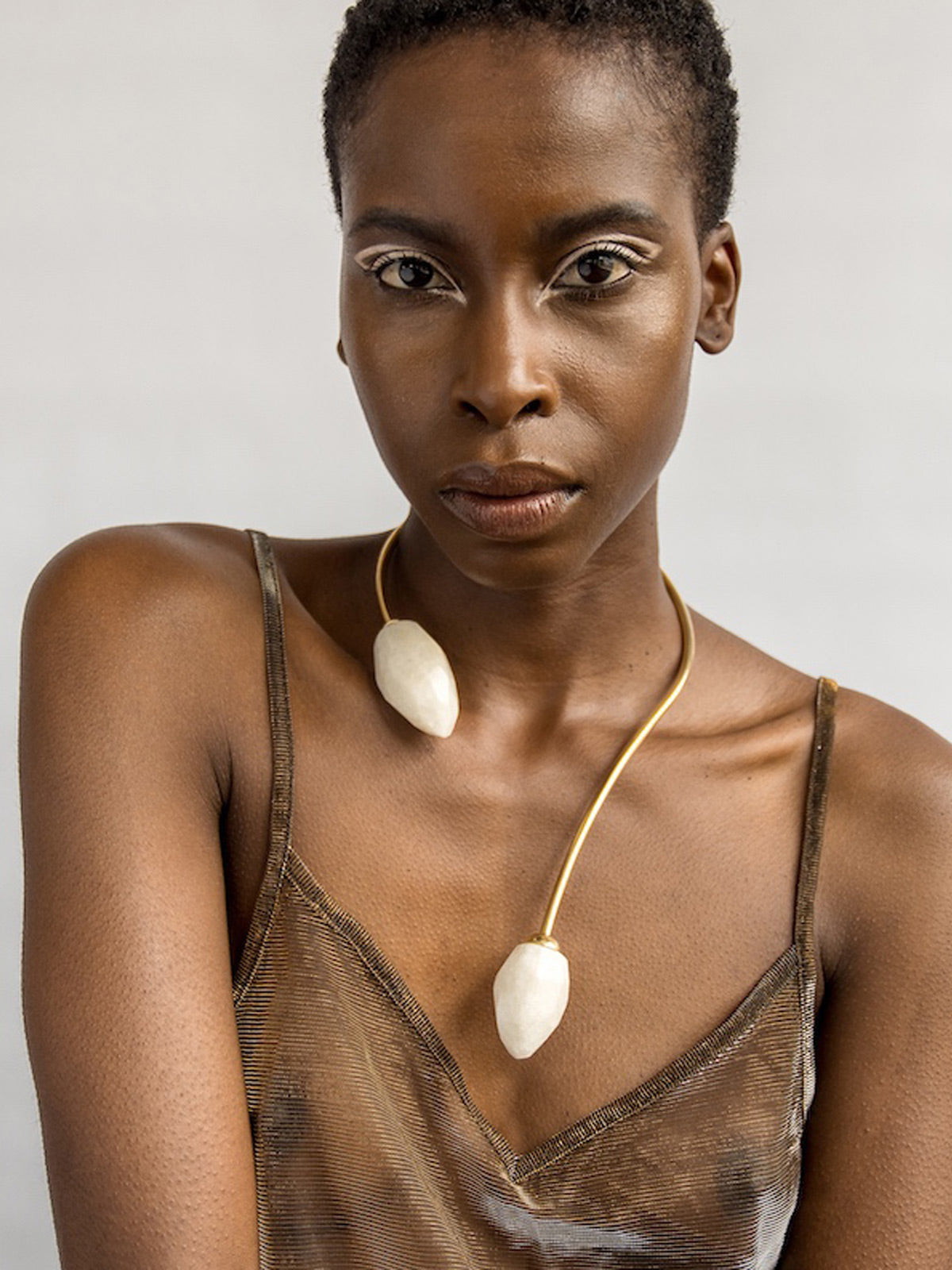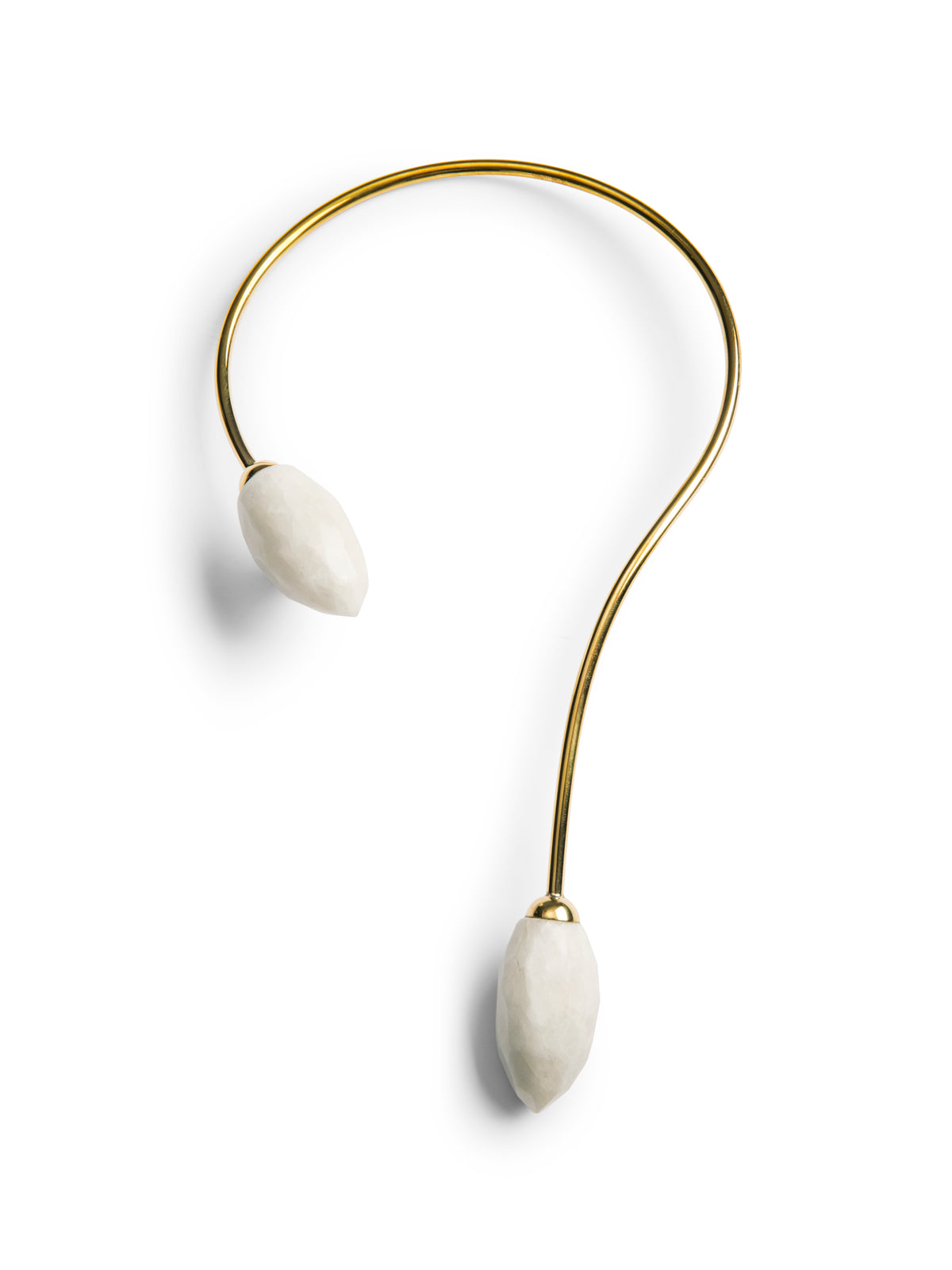 The "Quartz Torque" is a sinuous stretch of brass - and another artisanal creation by Ami Doshi Shah — that drapes asymmetrically over your collar bone. It's punctuated by irregularly faceted white quartz — wear it to add a sophisticated shine to a simple evening look.