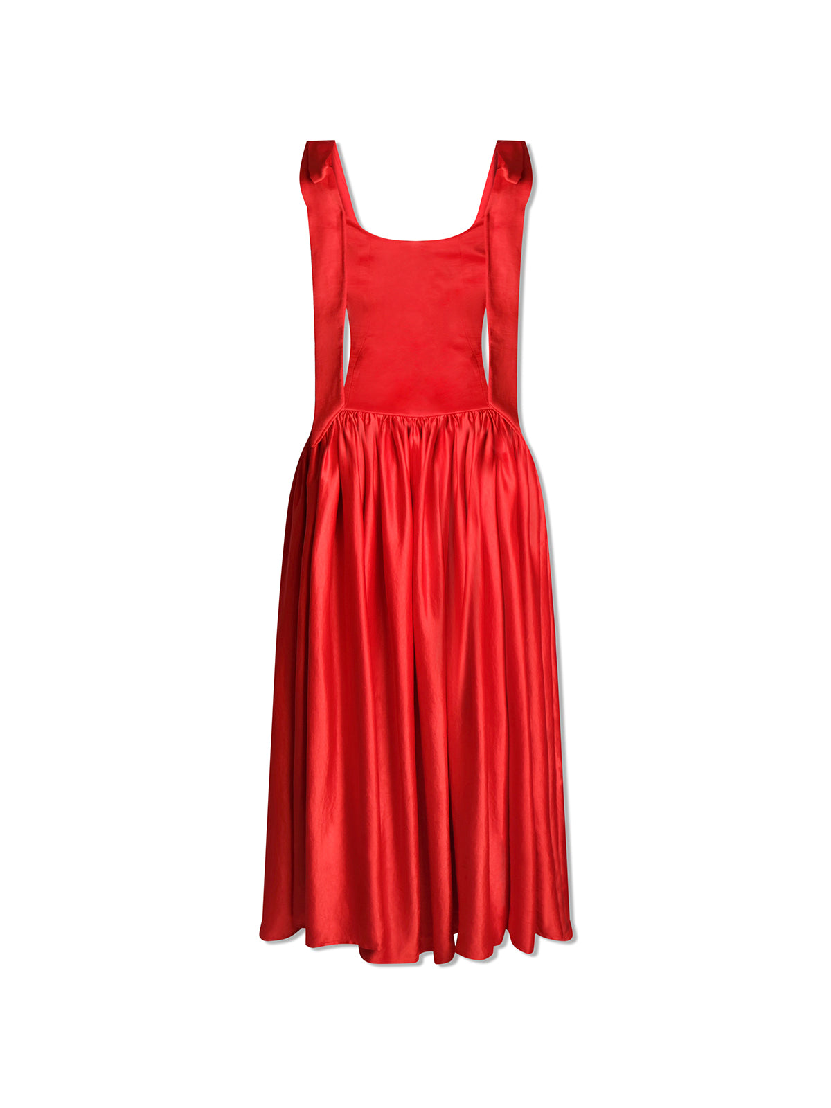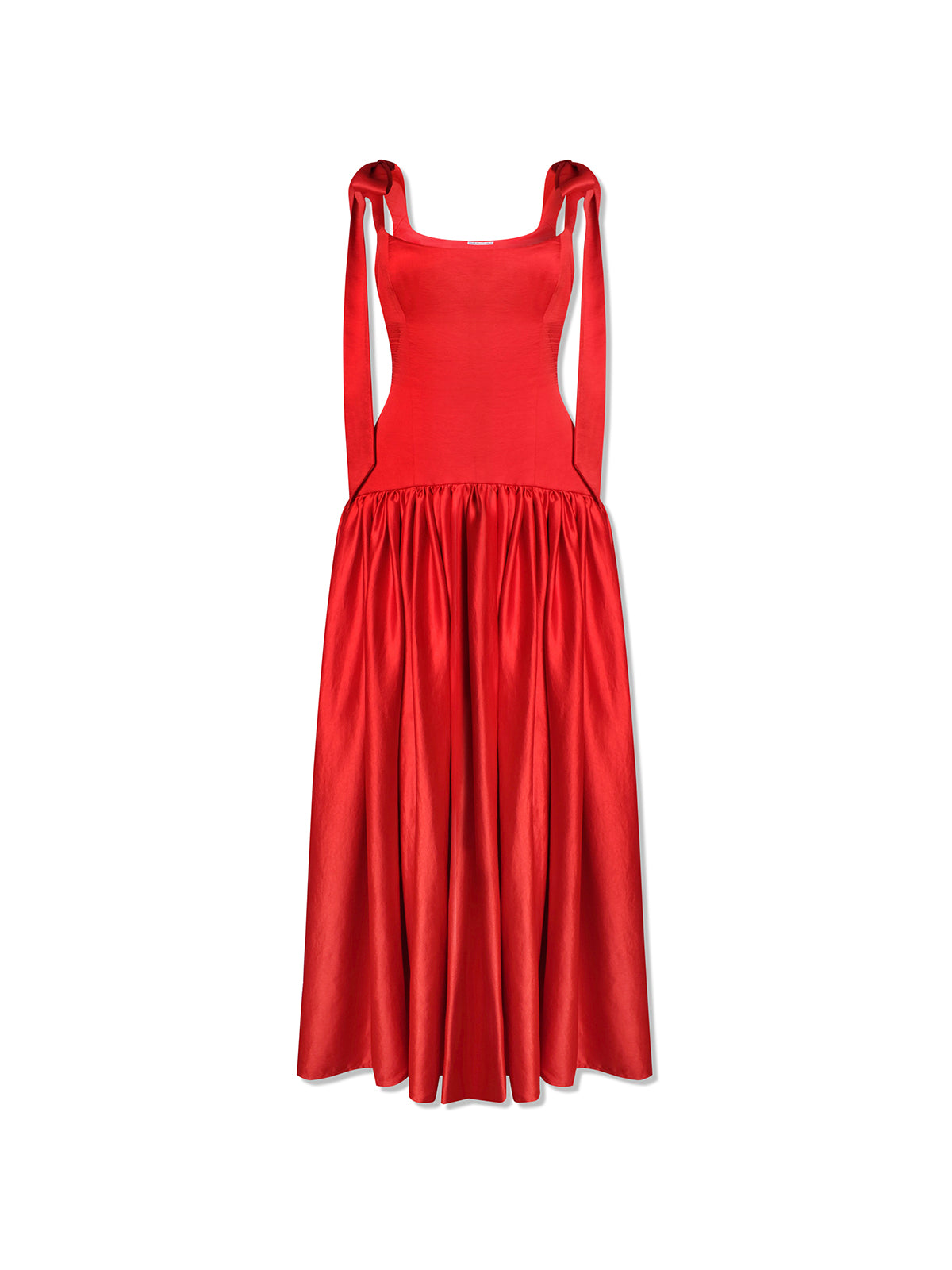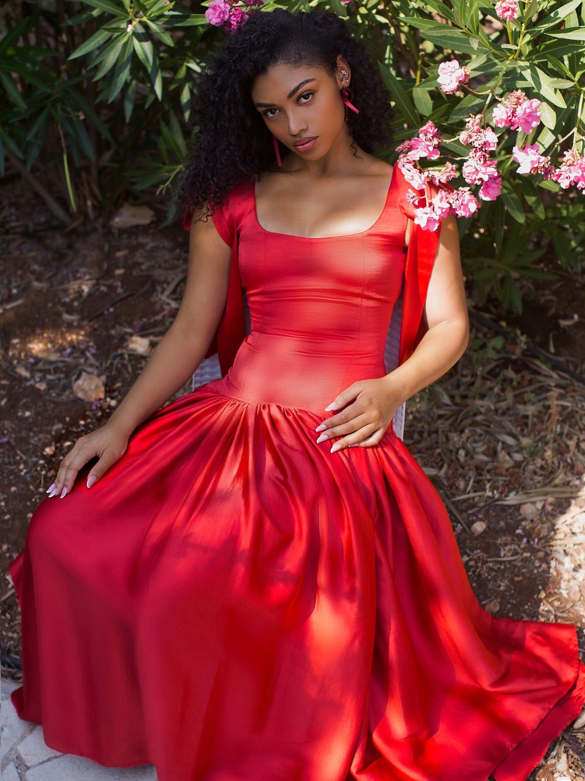 When a special occasion calls, you can count on Nigerian brand Rendoll to answer. This fire-red Saby Dress features a form-fitting bodice with a dropped waist and a square neckline framed by sweeping ties that can be knotted into delightful bows. Thoughtfully designed and crafted in Nigeria, it’s made from stretchy fabric that molds to your frame, while the voluminous ankle-length hem adds dramatic flair—perfect for showcasing your favorite footwear.