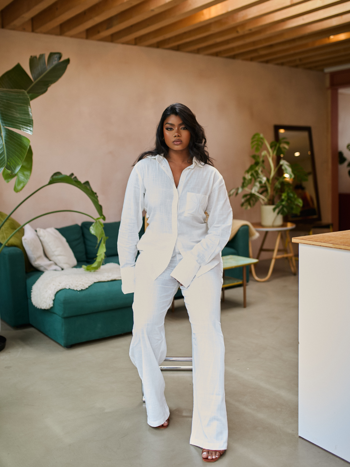 - Loose high-waisted silhouette