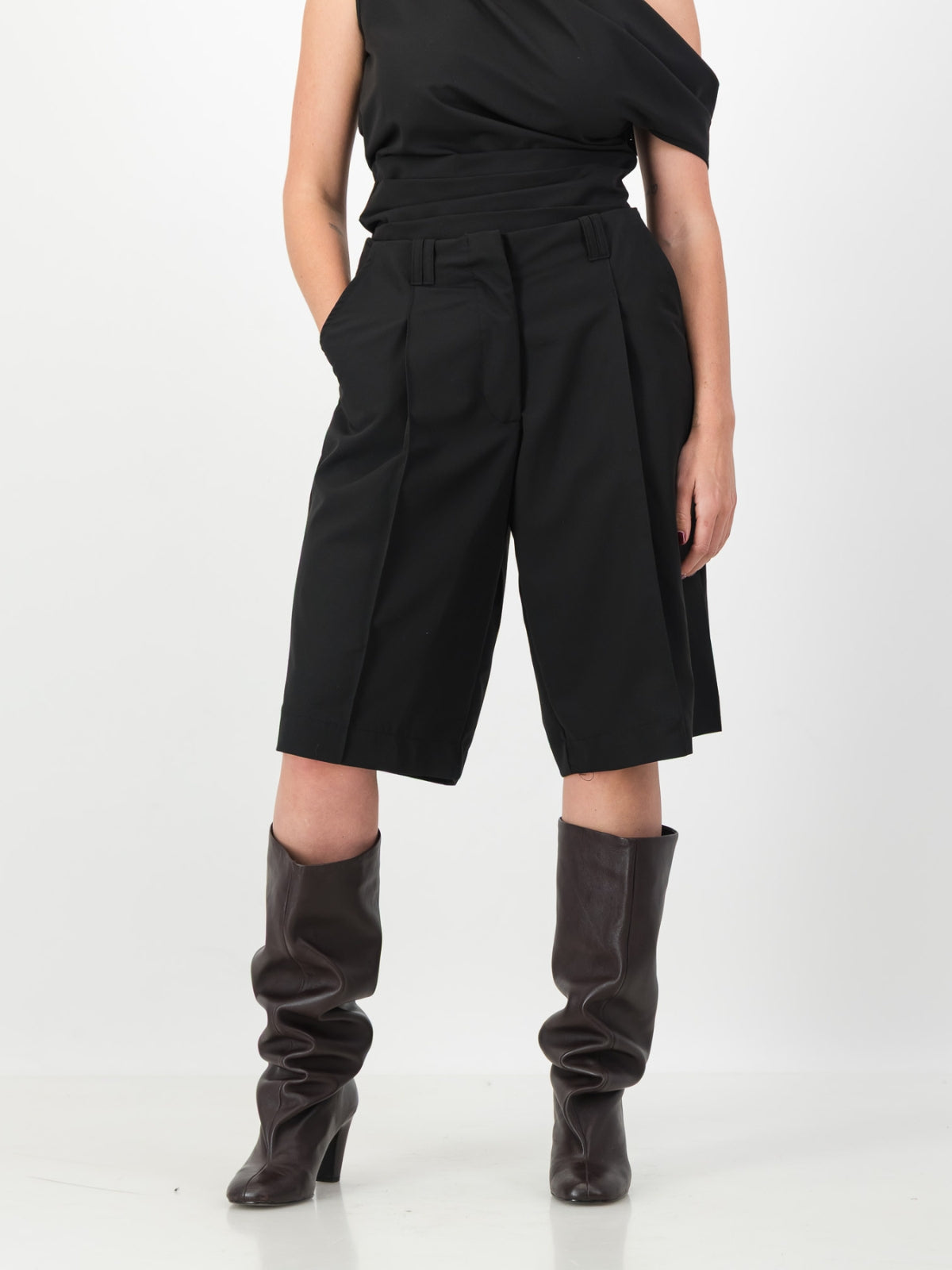 - Waistband with belt loops, concealed zip fastening, pleats, side pockets, rear welt pockets, knee length