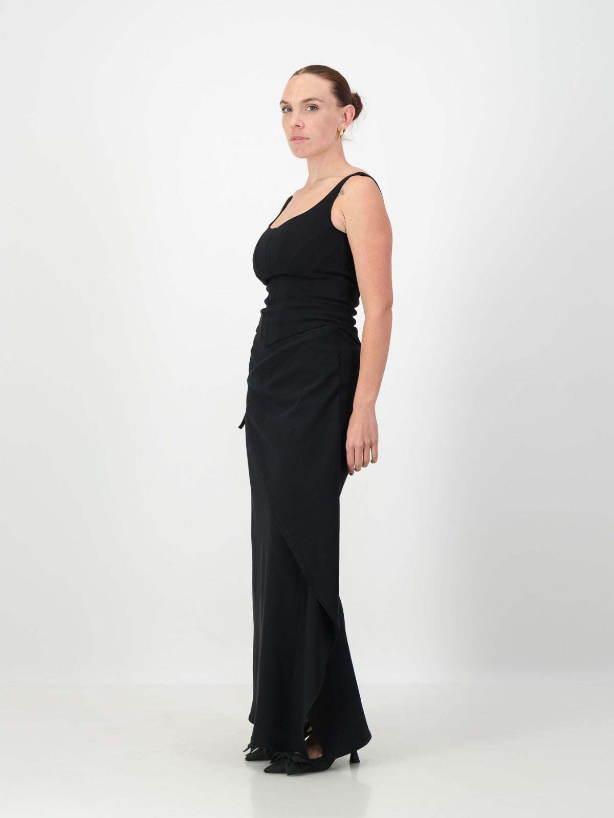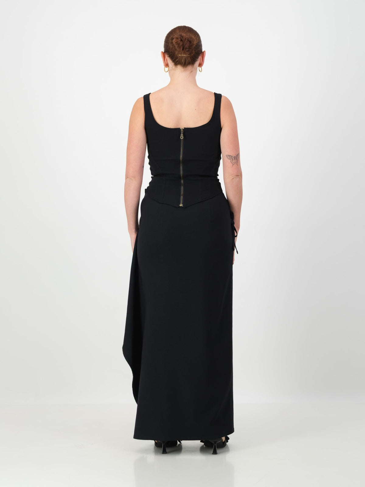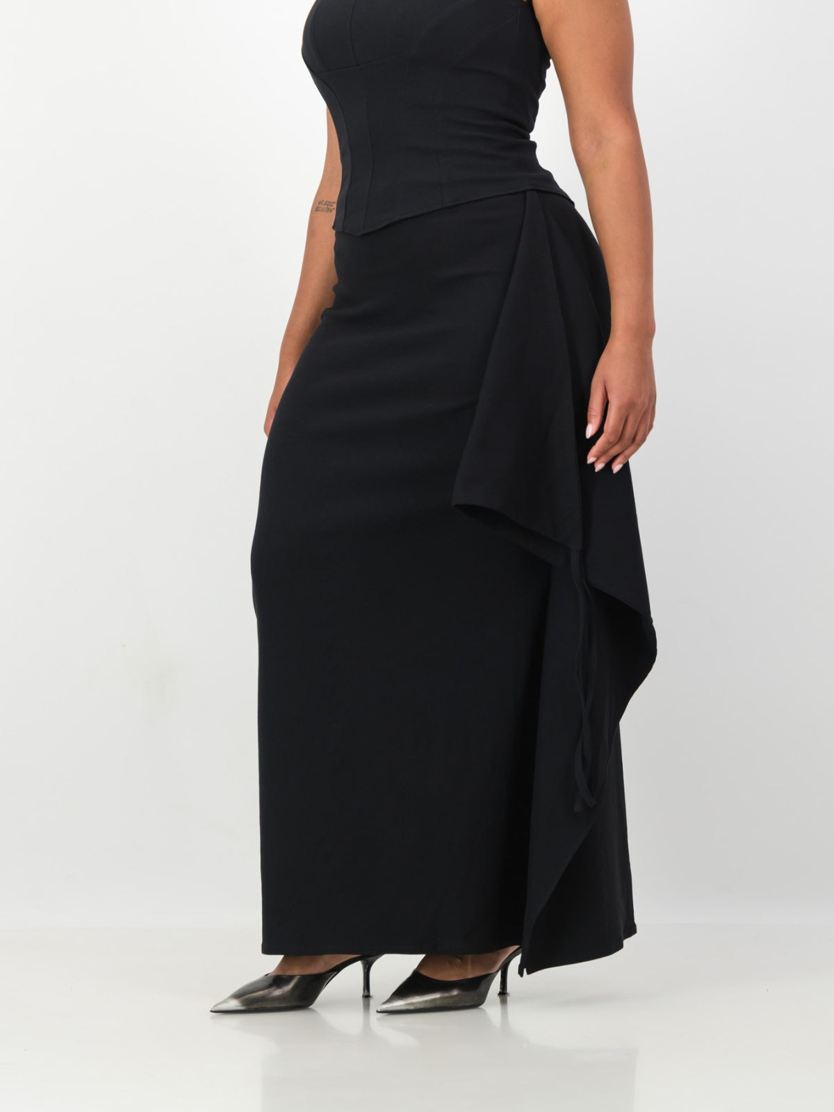 Rethread’s creations are minimalist but never plain: think sculptural lines, thoughtful proportions, and artful details. This Noir Skirt is crafted from elasticated cotton in a form-fitting pencil silhouette with an asymmetric draped panel and adjustable ties that create a soft, sculptural finish. Style it with the matching top or a crisp shirt for a refined yet directional look.