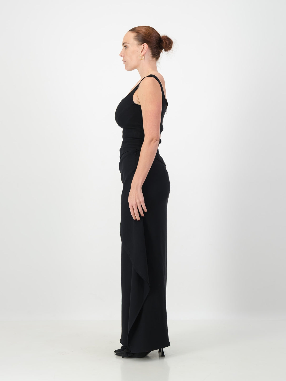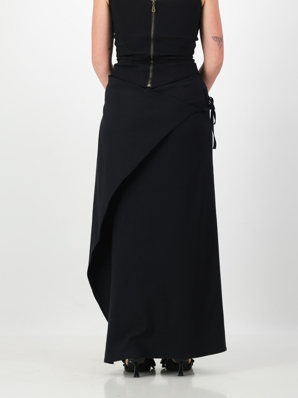 - Asymmetric draping, adjustable ties, side zip fastening, ankle length