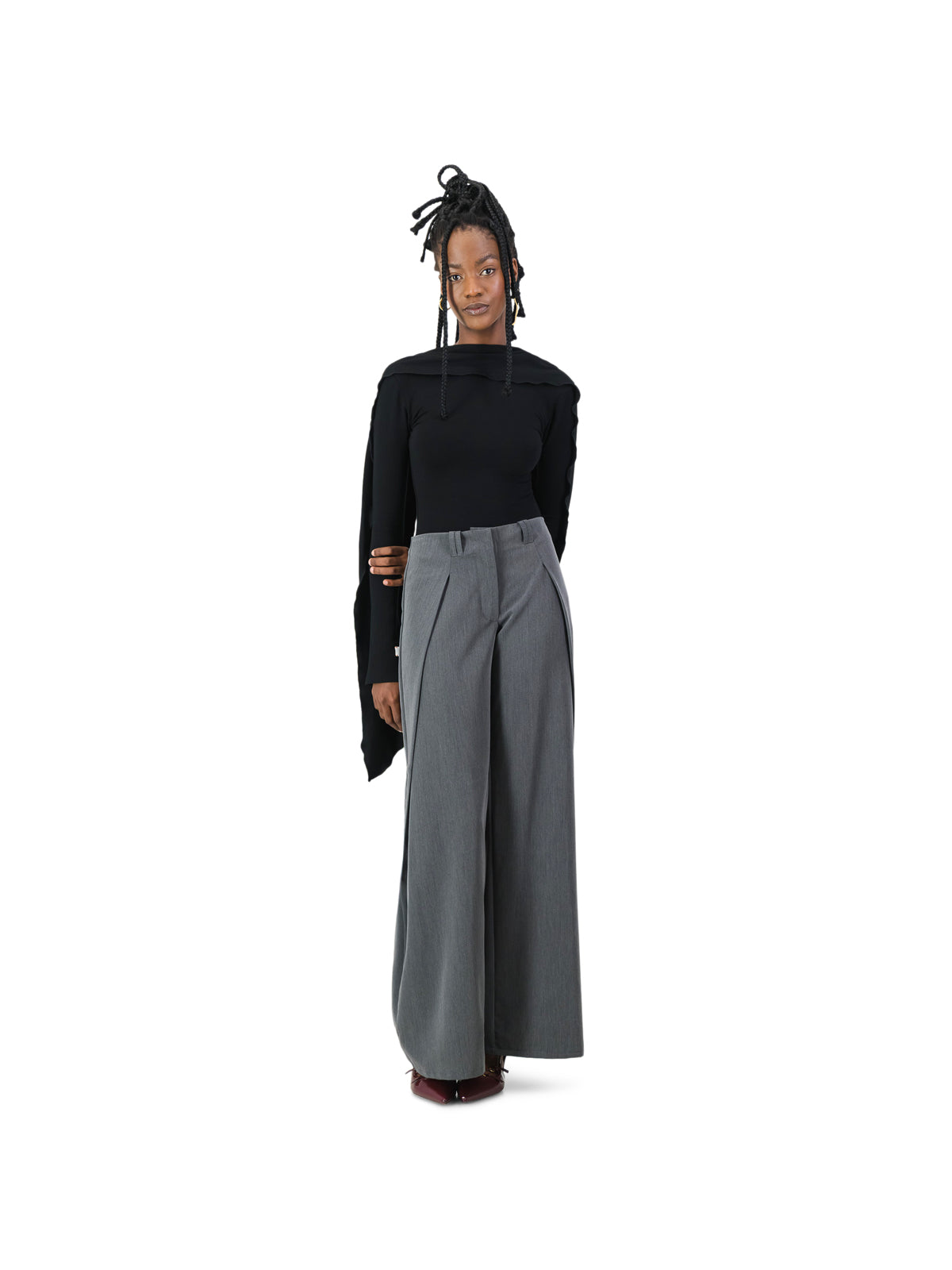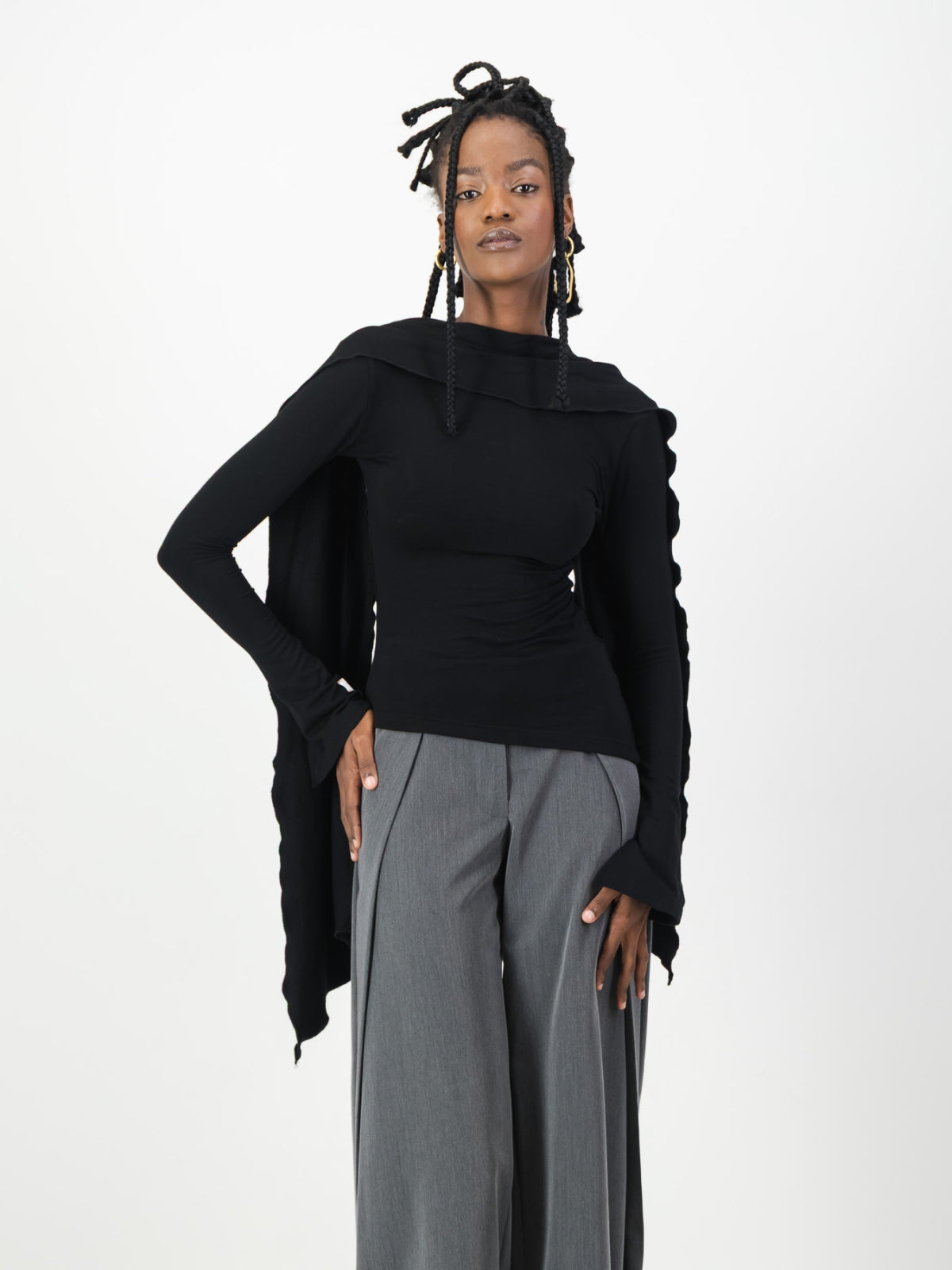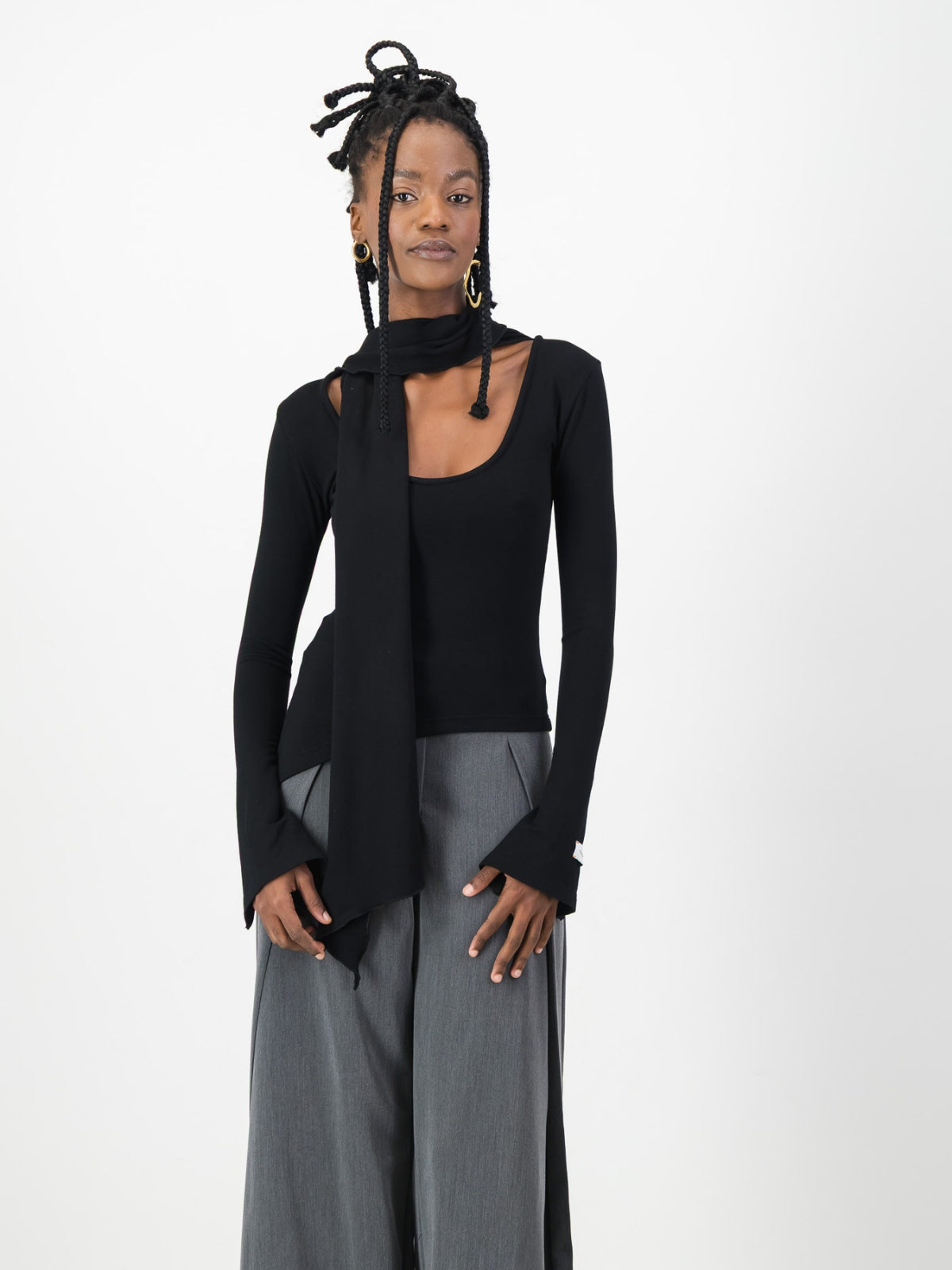- Scoop neckline, long sleeves, asymmetric hem, detachable scarf, hand-sewn label