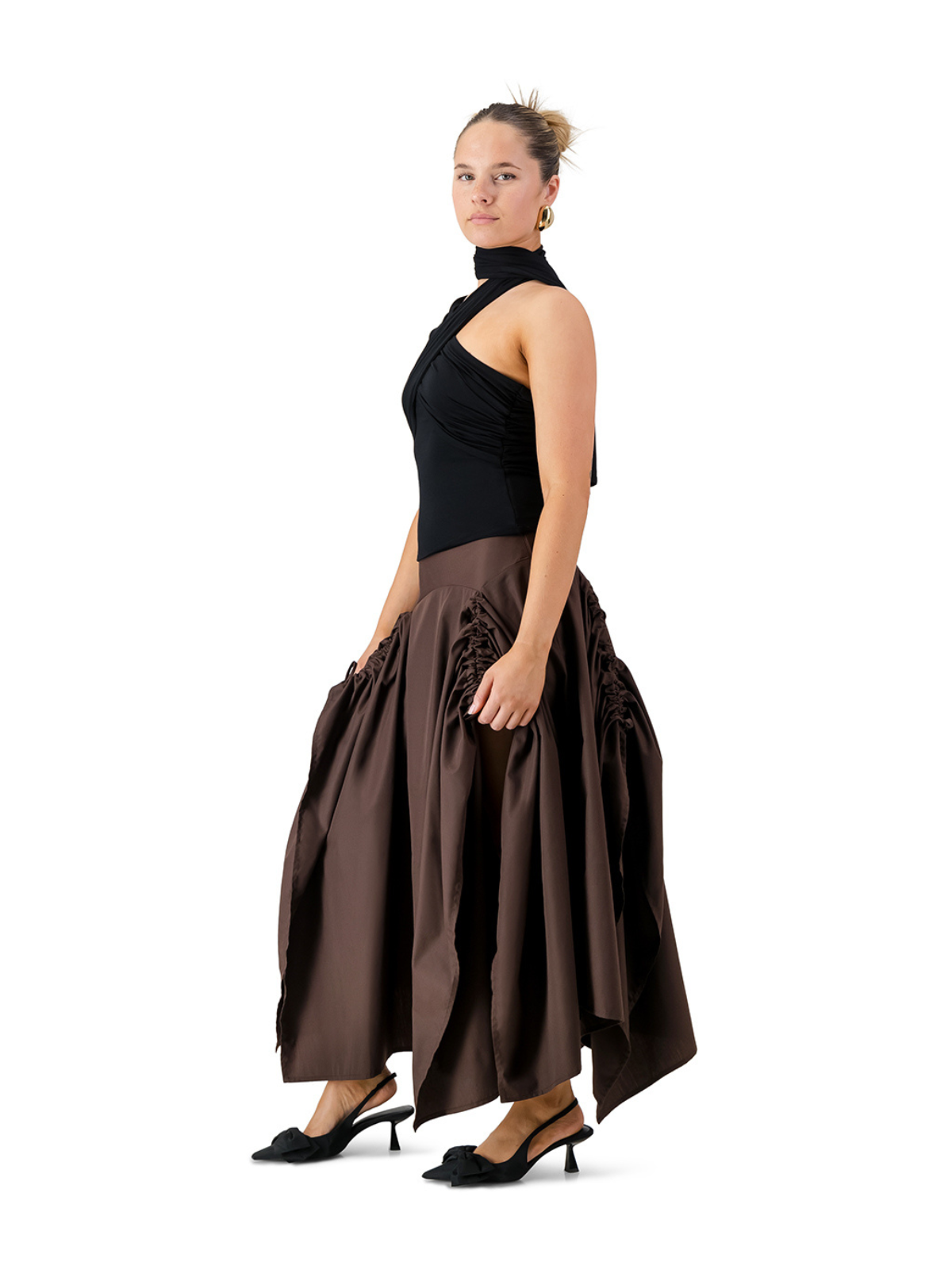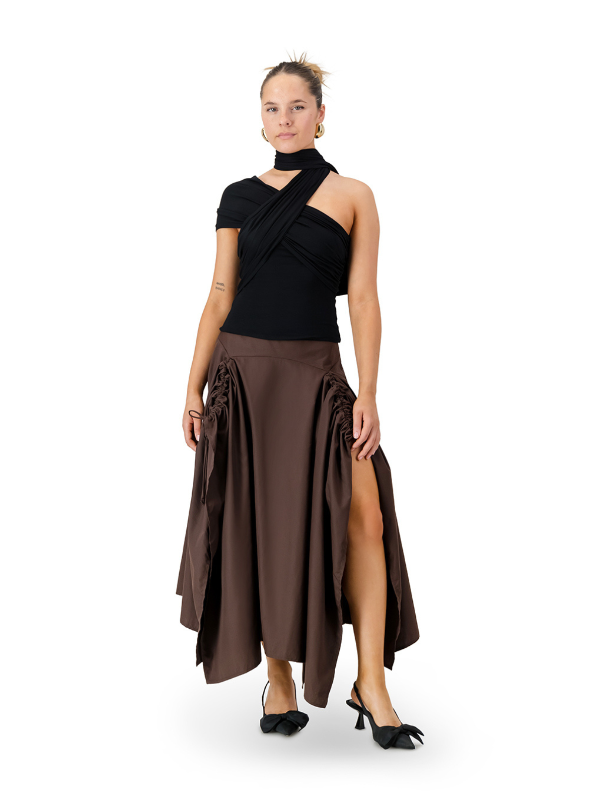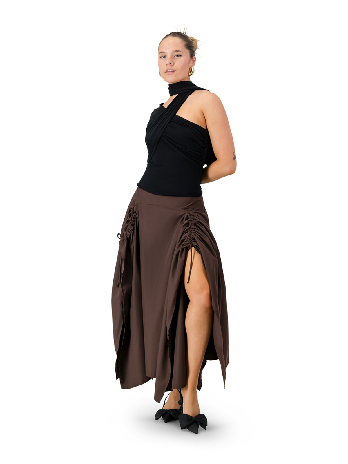 Cape Town-based label Rethread are celebrated for their ability to marry modern and cutting-edge silhouettes with fully sustainable production practices. Their Chocolate Gaia Skirt is sewn from panels of a soft cotton blend with a unique maxi hem that drapes into asymmetric points. The adjustable ruching allows you to customize the length and create dramatic, flowing lines. We like it styled with the brand's matching Black Iris Wrap Top.
