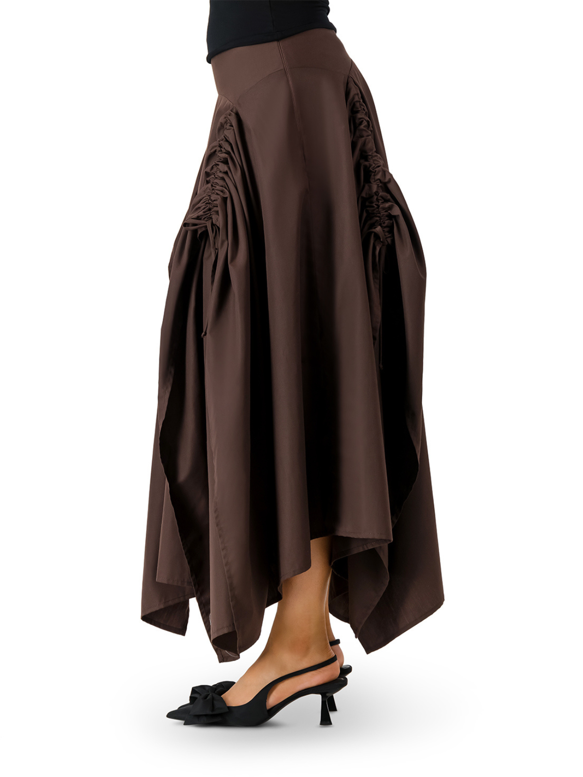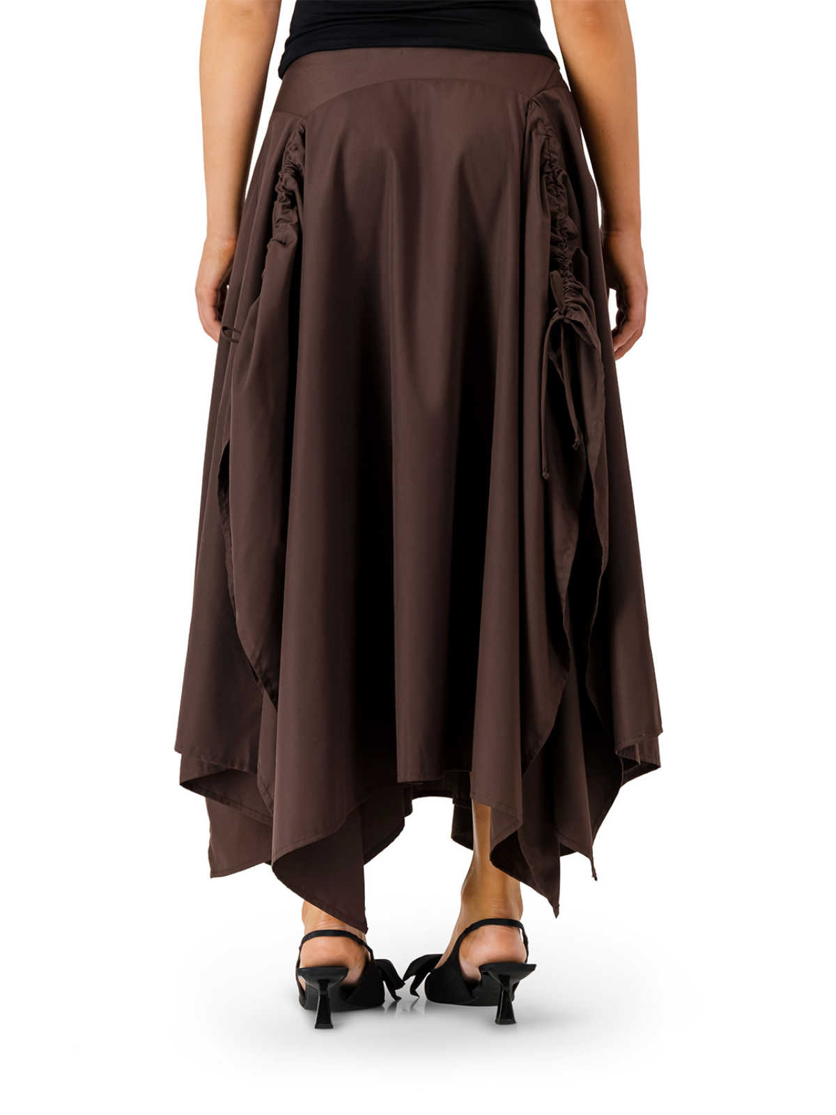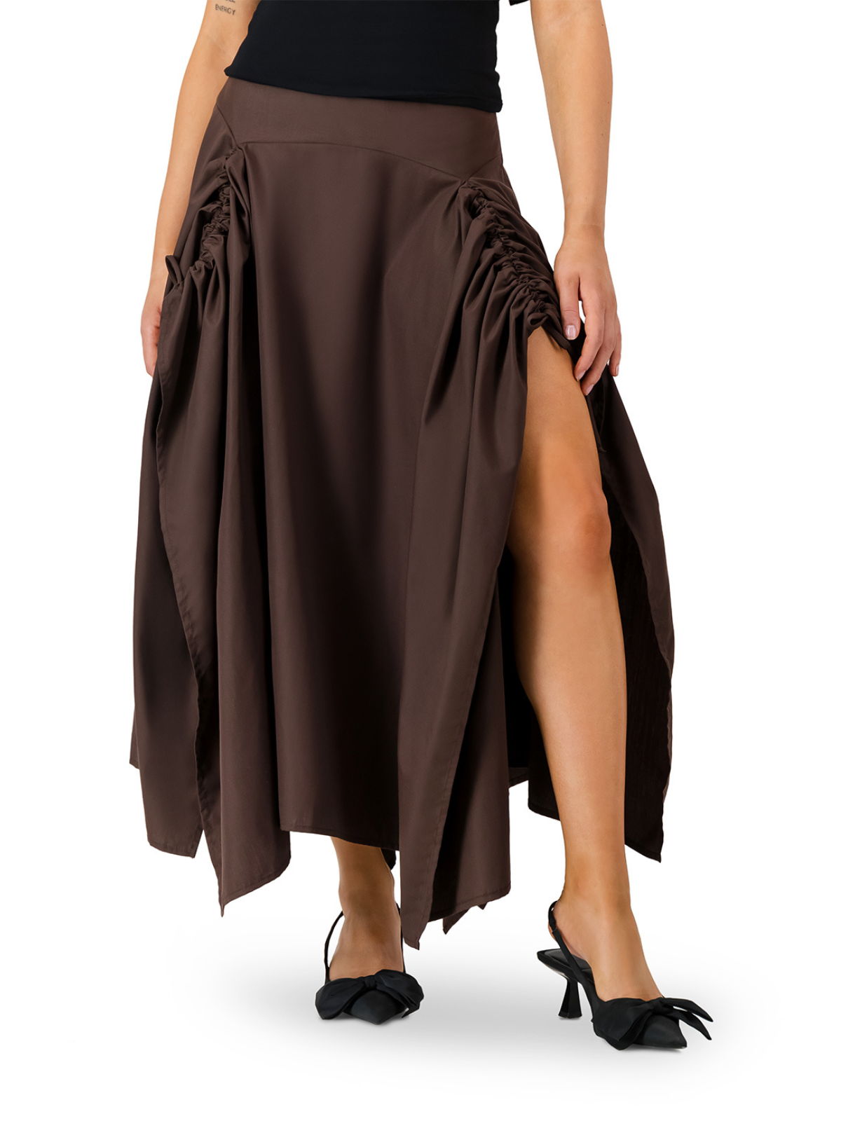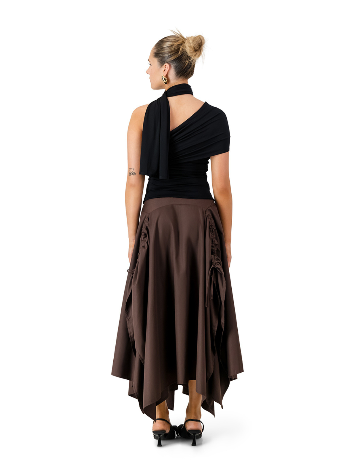 Cape Town-based label Rethread are celebrated for their ability to marry modern and cutting-edge silhouettes with fully sustainable production practices. Their Chocolate Gaia Skirt is sewn from panels of a soft cotton blend with a unique maxi hem that drapes into asymmetric points. The adjustable ruching allows you to customize the length and create dramatic, flowing lines. We like it styled with the brand's matching Black Iris Wrap Top.