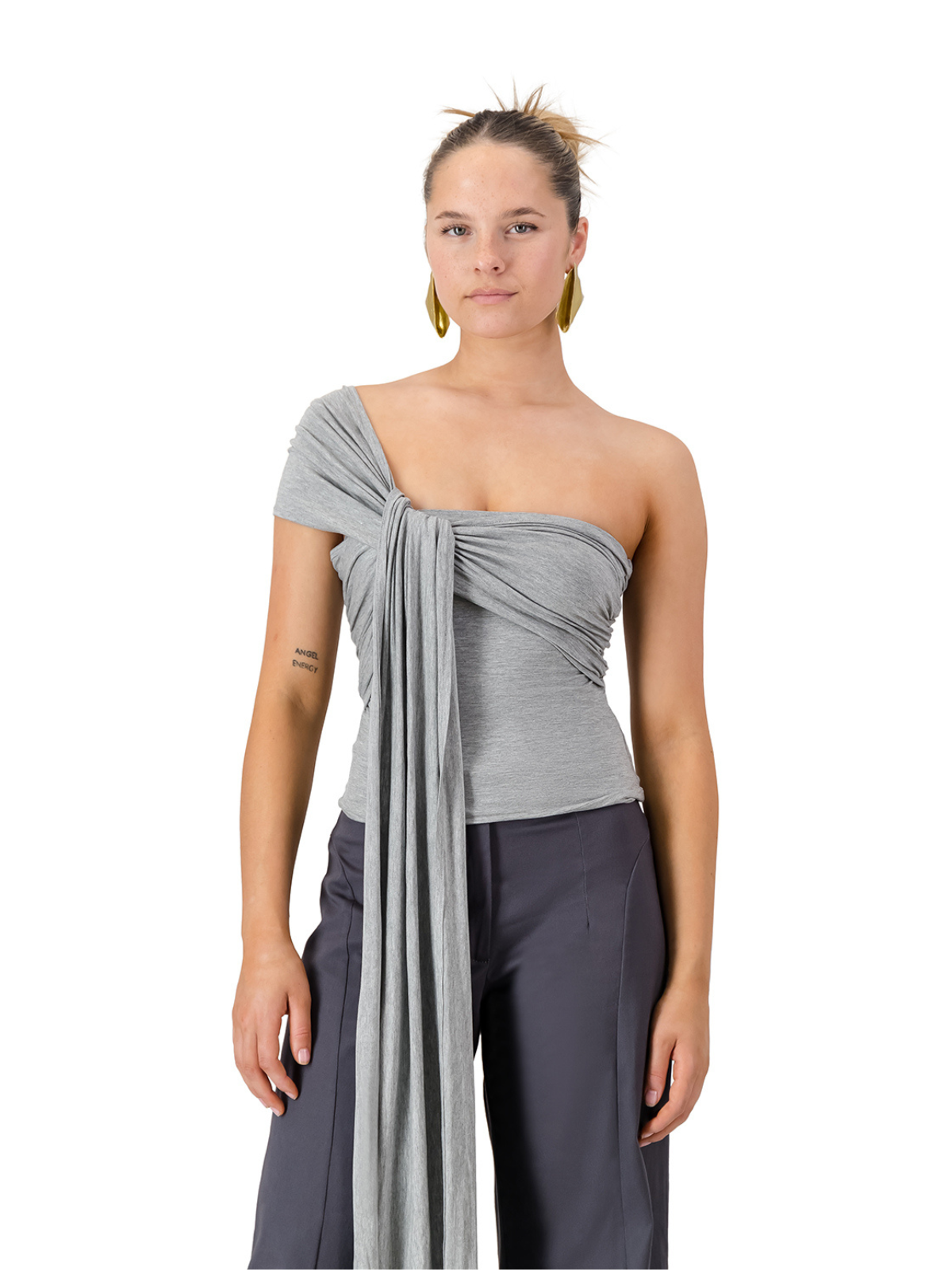 Rethread's Grey Iris Wrap Top is crafted from ultra-soft and smooth stretch fabric in a neutral grey shade with an elasticated strapless neckline for a secure fit. The versatile design is sewn with a long tie offering endless options for styling—wrap, twist, or knot it depending on the occasion.