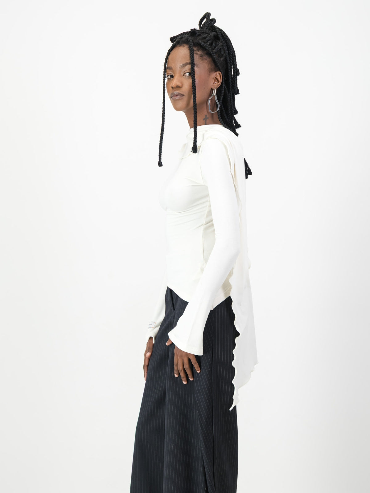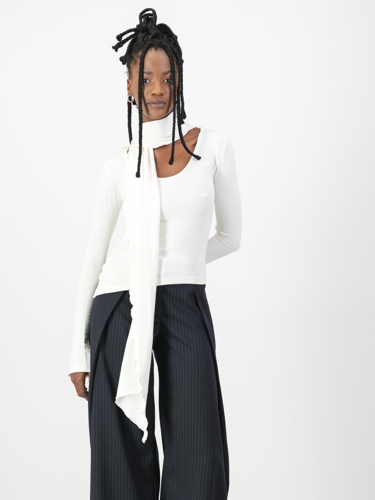 - Scoop neckline, long sleeves, asymmetric hem, detachable scarf, hand-sewn label