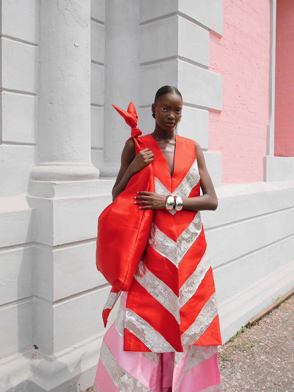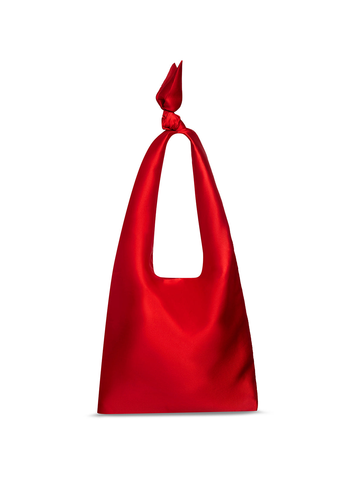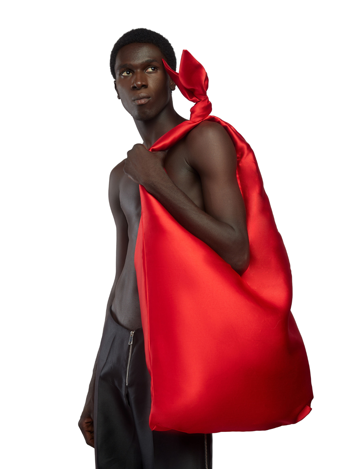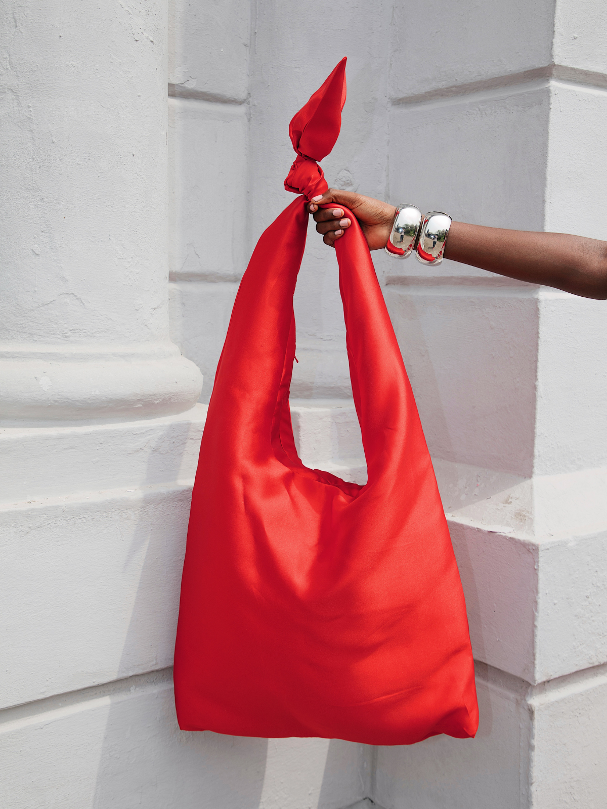 Nigerian designer Frank Aghuno works closely with a small team of female artisans who handcraft each piece using traditional local techniques. Made from pure Mikado silk, this Àpo Hobo Bag steals the spotlight with its fiery red shade and supersized proportions. It features a softly rounded shape, an artfully knotted shoulder strap, and a top zip fastening that reveals a spacious main compartment. Use it to punctuate an otherwise all-black look.