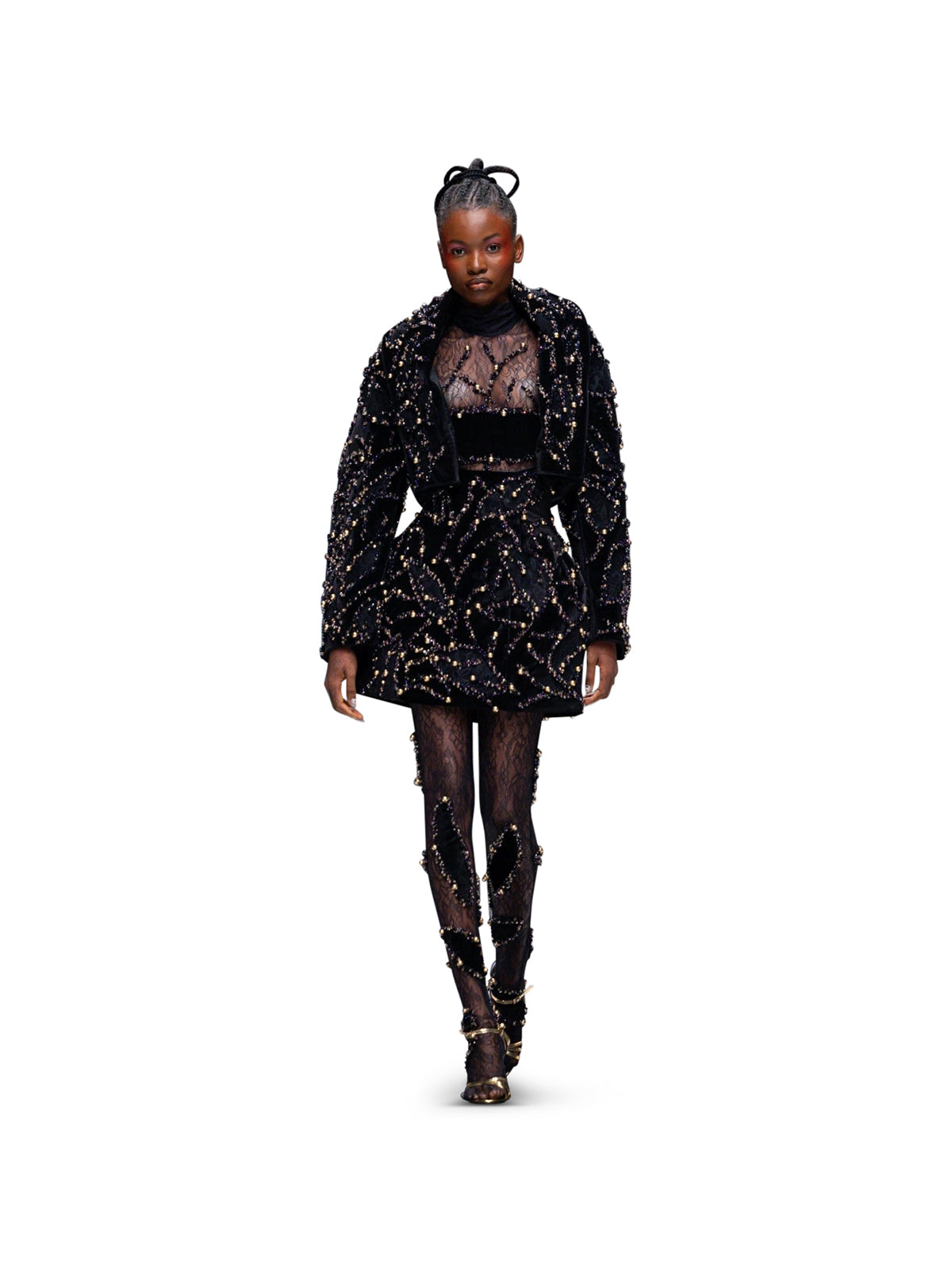 Sevon Dejana's latest collection fuses avant-garde craftsmanship and unapologetic femininity, as showcased by this three-piece Karma Set. Comprising a bolero jacket, a bodysuit, and a mini skirt, the tonal mix of velvet and Chantilly lace is illuminated with gold and purple crystal beads and pearls, meticulously applied by hand by the brand's artisans. Take styling cues from the runway look and wear yours with embellished tights.