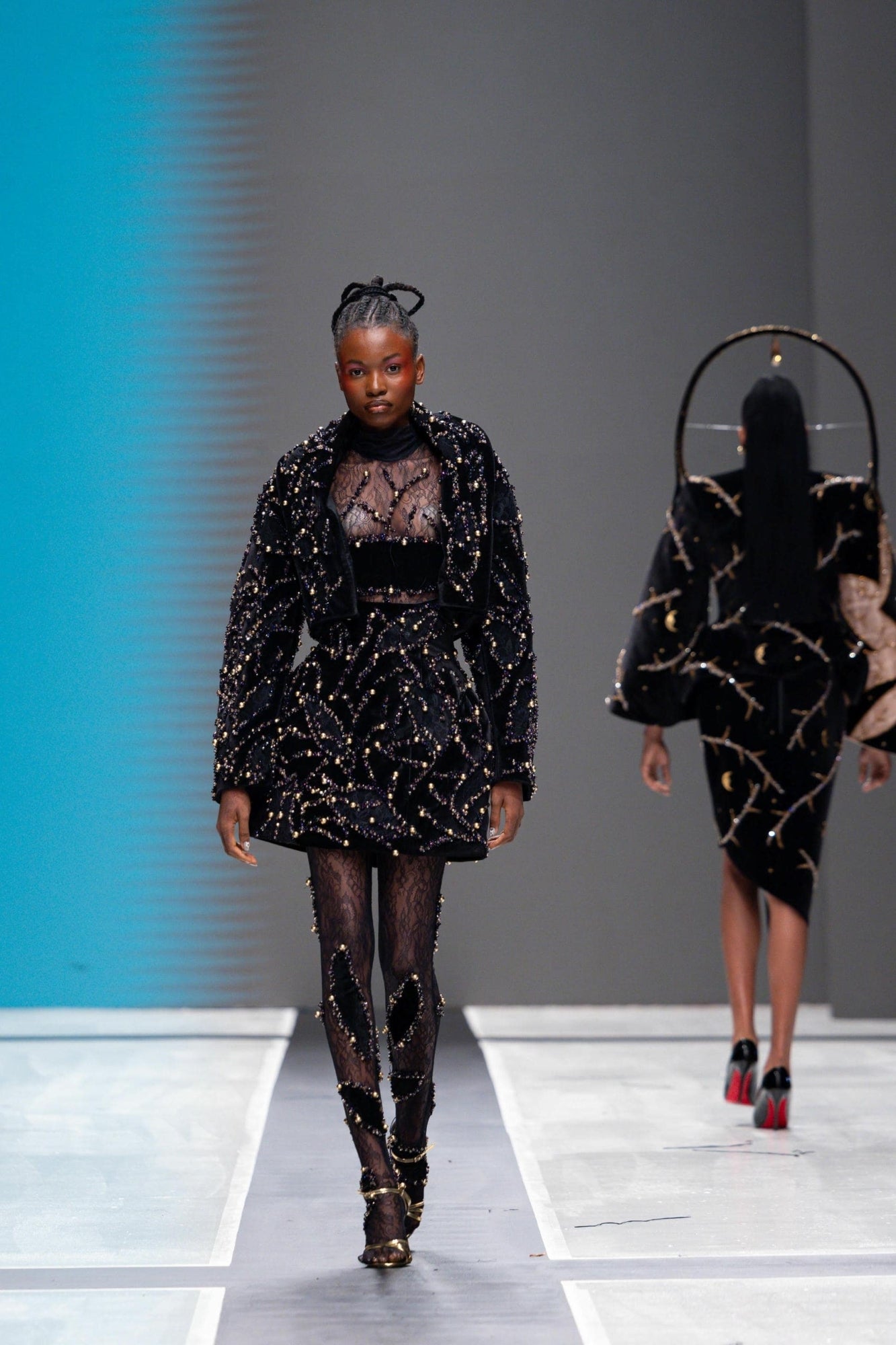 Designer Segun Aladejana channels a belief in fashion as art into high-impact eveningwear defined by decadence, sensuality, and craftsmanship. The house cuts architectural gowns, sharp suiting, and statement separates with couture-inspired construction—structured bodices, sculpted volume, and dense crystal work—to create pieces that are unapologetically theatrical yet precisely considered.