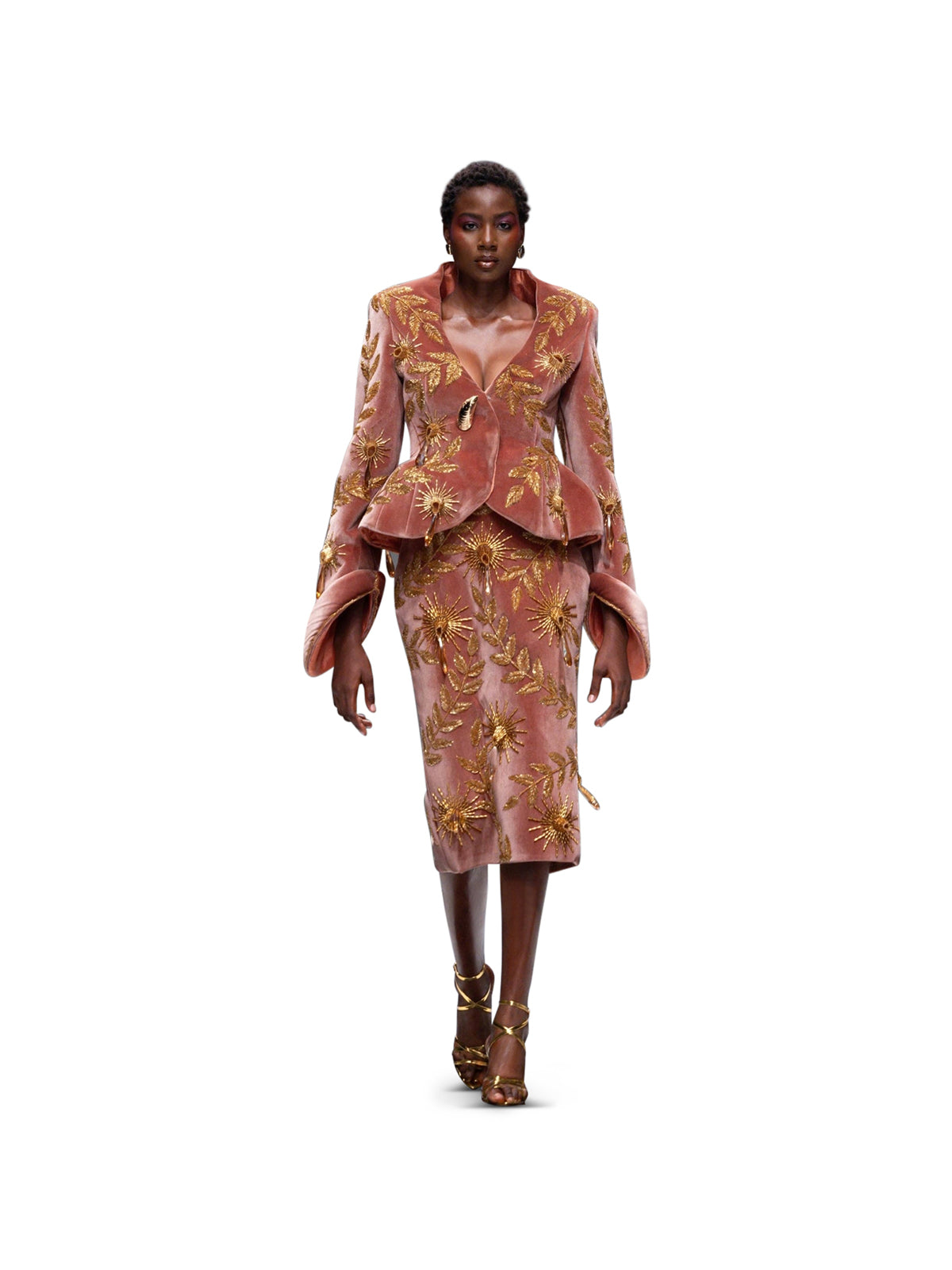 Past and future meet in this Solace Skirt Suit by Nigerian designer Sevon Dejana—presented as part of the Lagos Fashion Week 2025. It's crafted from blush velvet and crepe, meticulously embroidered with gold crystal beads and hand-applied embellishments. The sculptural jacket with dramatic sleeves is complemented by a midi pencil skirt—style it with barely-there gold jewelry and metallic heels, as seen on the runway.