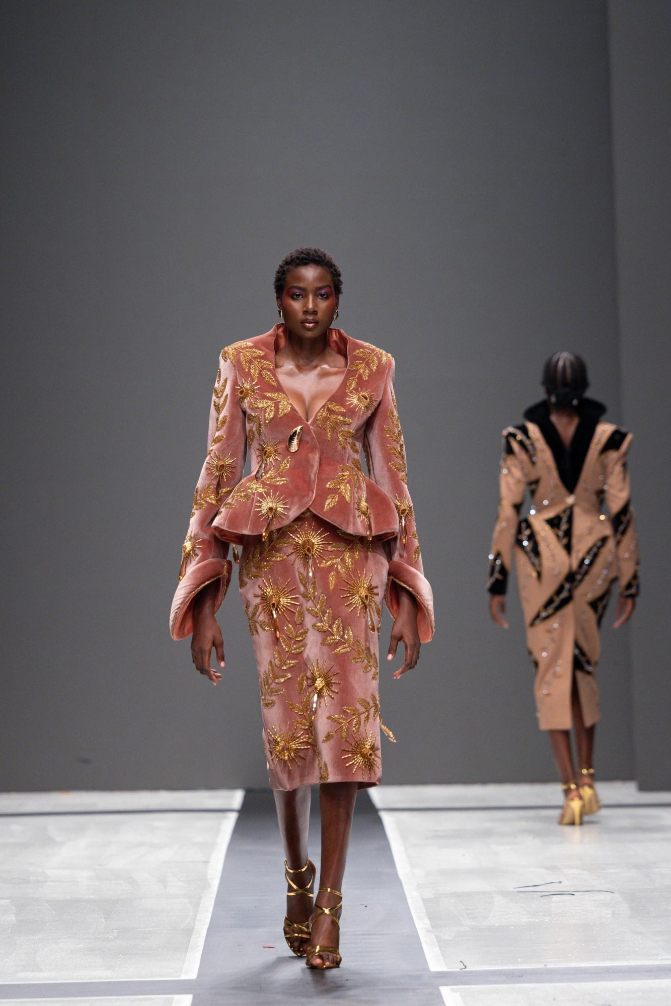 Designer Segun Aladejana channels a belief in fashion as art into high-impact eveningwear defined by decadence, sensuality, and craftsmanship. The house cuts architectural gowns, sharp suiting, and statement separates with couture-inspired construction—structured bodices, sculpted volume, and dense crystal work—to create pieces that are unapologetically theatrical yet precisely considered.