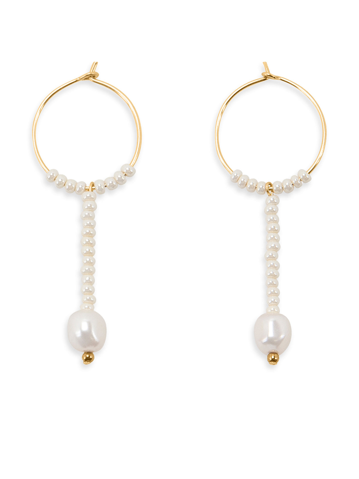 - 14 karat gold filled hoop, glass beads, Swarovski pearls