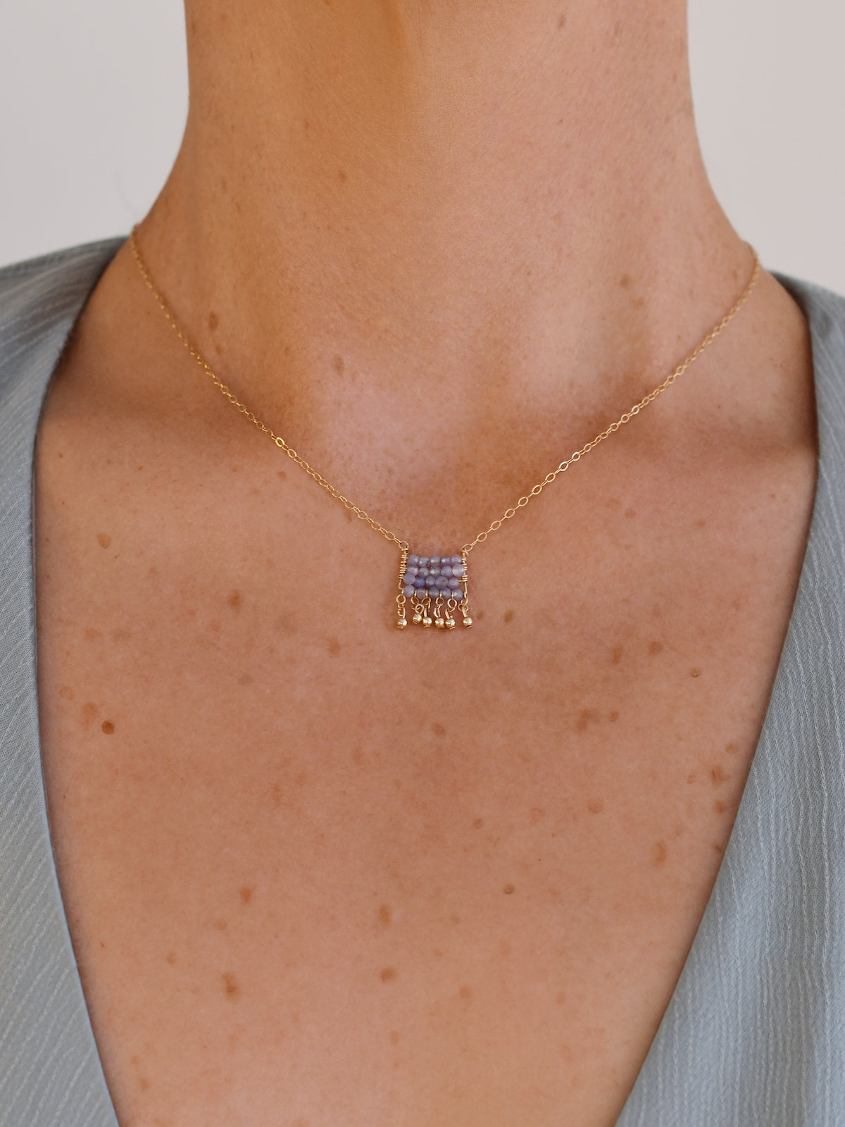 Sidai Designs creates contemporary pieces based on traditional Maasai beading techniques. Handcrafted in Arusha, this sparkling necklace is made from lavender Tanzanite beads detailed with intricate chain-link tassels. Adjust the dainty gold chain to a shorter length to enhance your décolletage or wear it long and layered to add texture to a stack of jewelry.