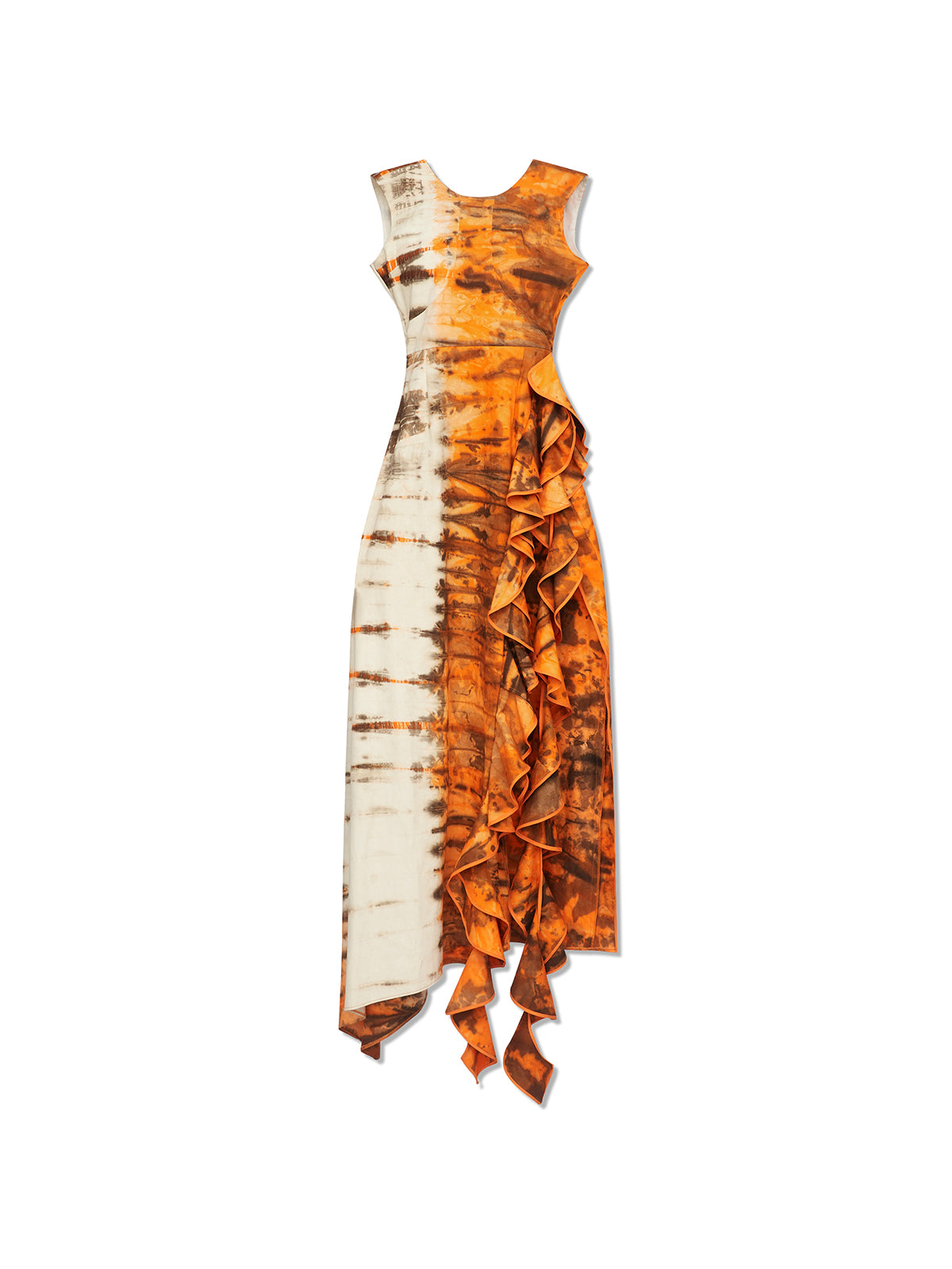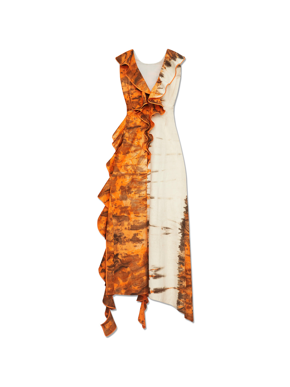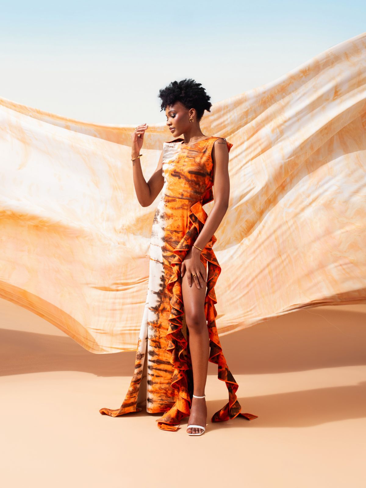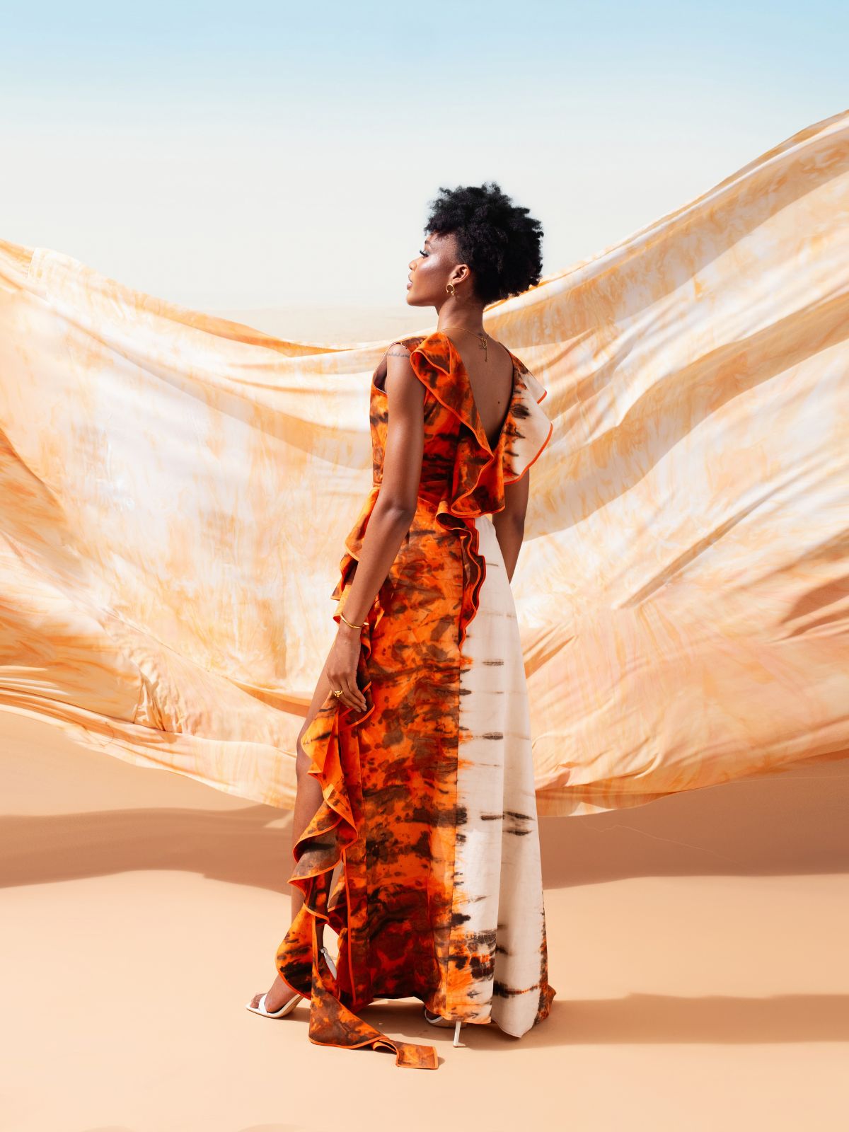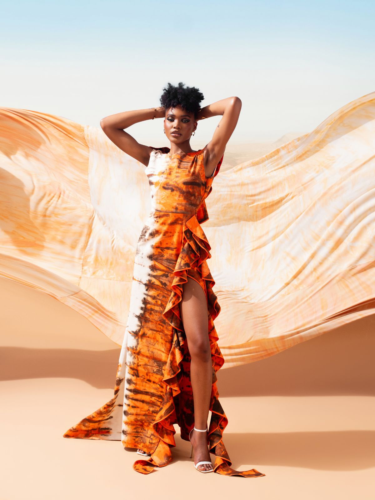 Sisiano’s Bertha Dress is cut from pure cotton and hand-painted by local dyers in Abeokuta, Nigeria, putting a fresh spin on tradition. The tribal print and vibrant color palette nod to the brand’s roots, while the streamlined silhouette, cascading ruffles, and thigh-high slit result in impactful simplicity—perfectly in line with today’s trends. Wear yours with sneakers in the city, switching to stilettos after dark.
