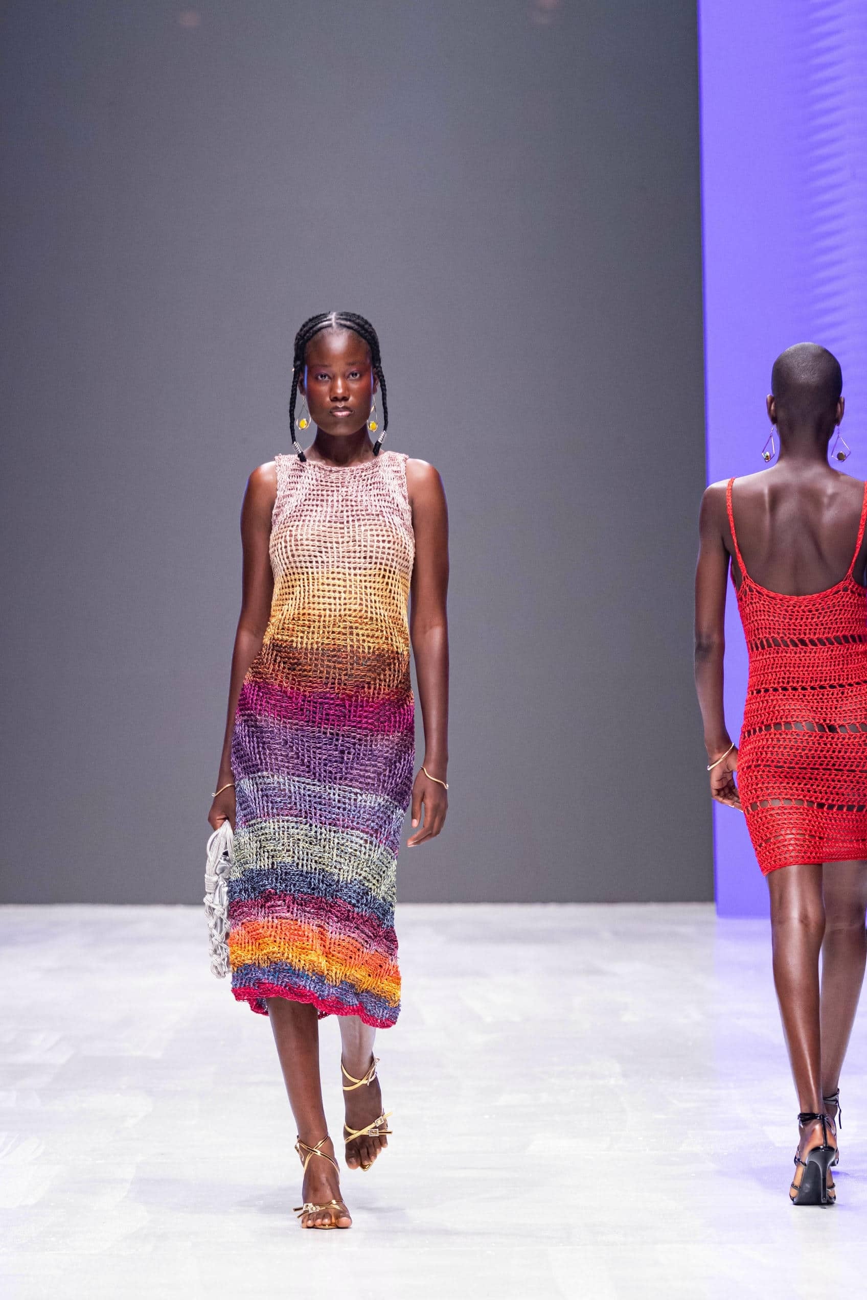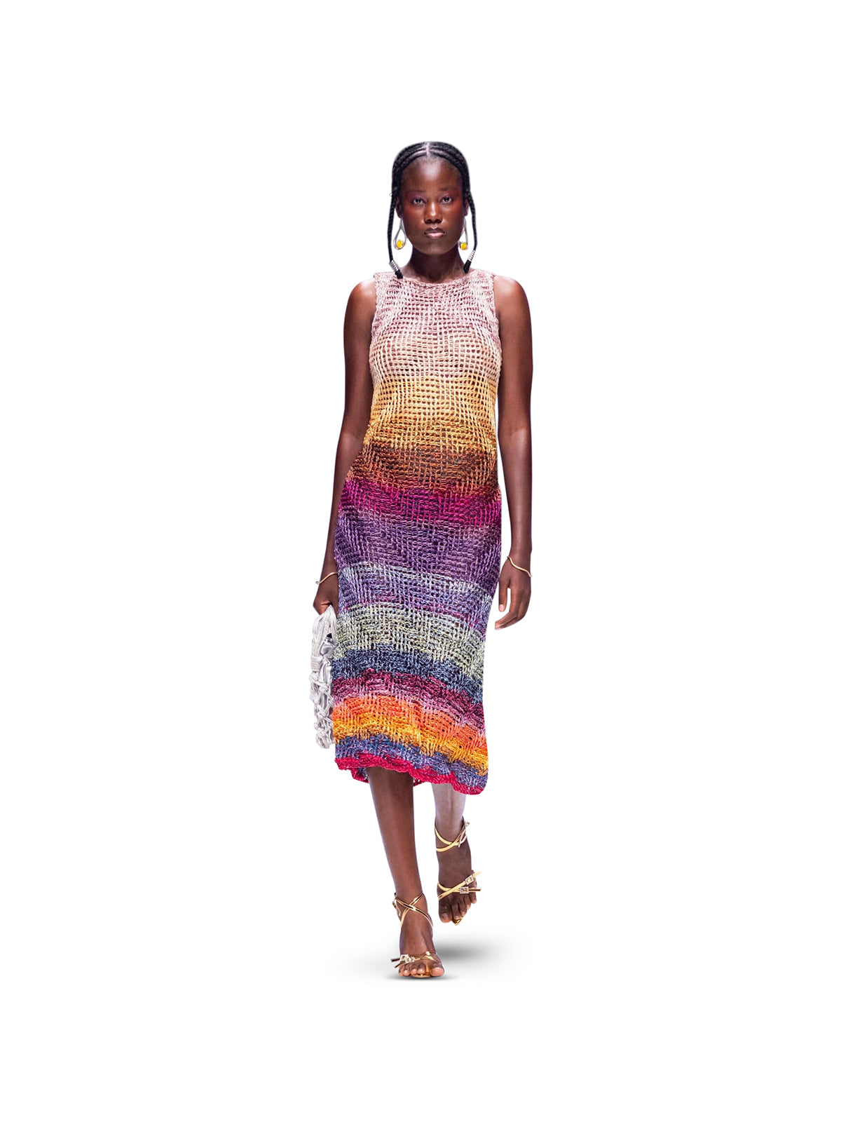 Expressive and vibrant, Studio Imo's Arachne Dress is meticulously crochet-knitted with an ever-so-subtle chevron pattern in a rainbow of colors, flecked with light-catching threads. The soft semi-sheer texture skims over your figure, creating a silhouette that feels both undone and polished. For an outfit with impact, style yours with equally unapologetic accessories.