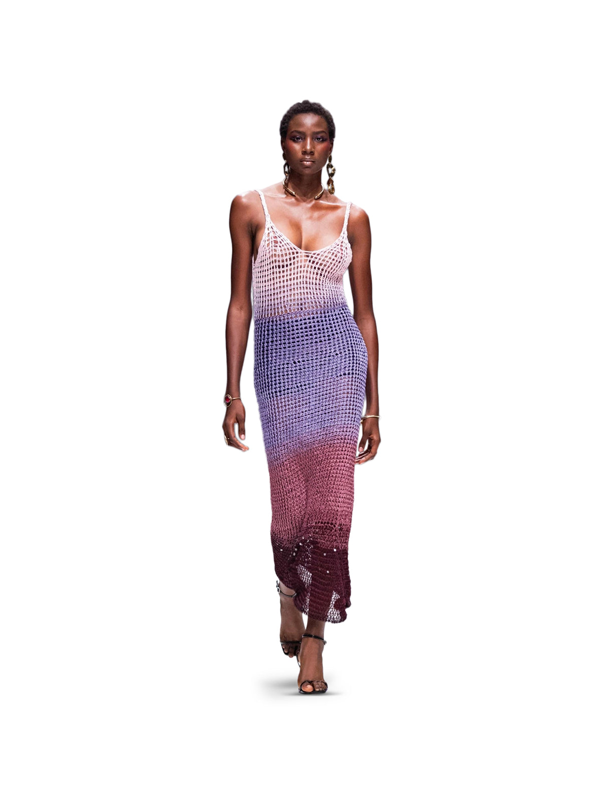 Crochet-knitted in Nigeria, Studio Imo's Demeter Dress has a figure-skimming profile, enhanced by a vibrant ombré colorway. The timeless slip silhouette offers understated sensuality for any setting, while the delicate sheer detailing blurs the line between the beach and sunset drinks. Add simple thong sandals and an oversized raffia tote to complete the look.