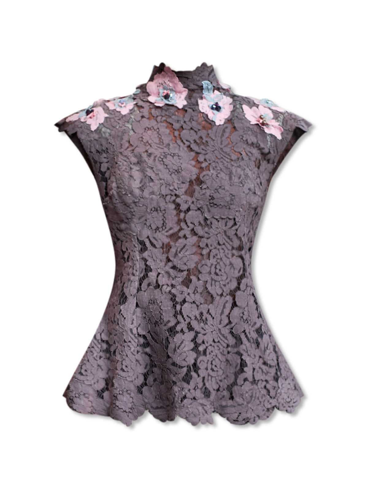 This Blossoming Echeveria Top by Viviers reinterprets lace through a contemporary lens. The semi-sheer finish adds lightness to the sculptural silhouette, sharpened by tulle-covered shoulder pads, while 3D flowers, intricate beading, and a scalloped hem add a romantic counterpoint. Style it with the matching Echeveria Signature Lace Pants for an effortless evening look without the hassle of mixing and matching.