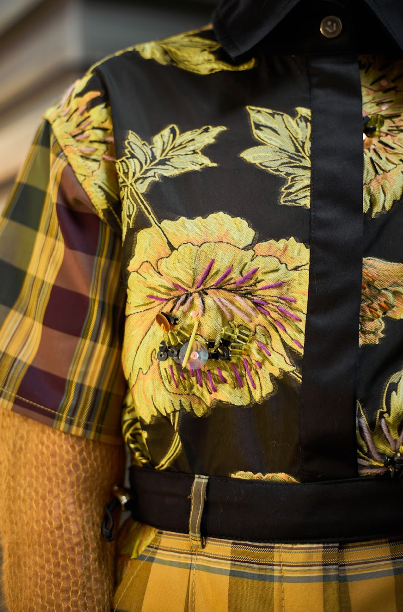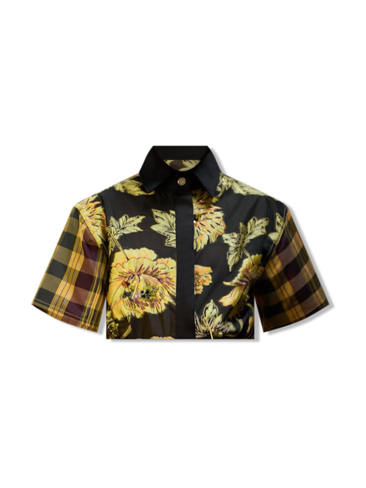 Crafted to awaken your creativity, this unisex Jeweled Daffodil Cropped Shirt by Viviers is assembled by hand from panels of printed brocade, reclaimed silk taffeta, and Egyptian cotton. A playful interpretation of a menswear classic, it features a pointed collar, short sleeves, and concealed fastening for a streamlined finish. Balance the boxy fit with slim tailoring or the matching Interlocked Checked Shorts.