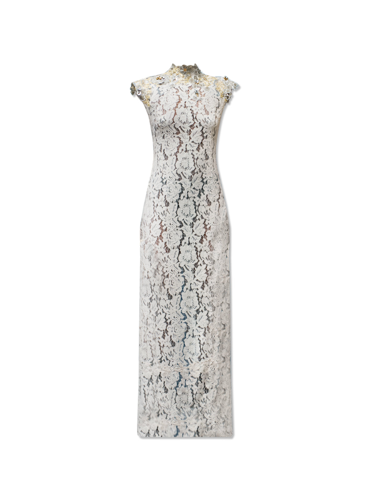 - Sleeveless, high neck, 3D flowers, beading, darts, zip fastening, double-layer construction, tulle-covered shoulder pads, open back, maxi length, hand-embroidered Viviers logo