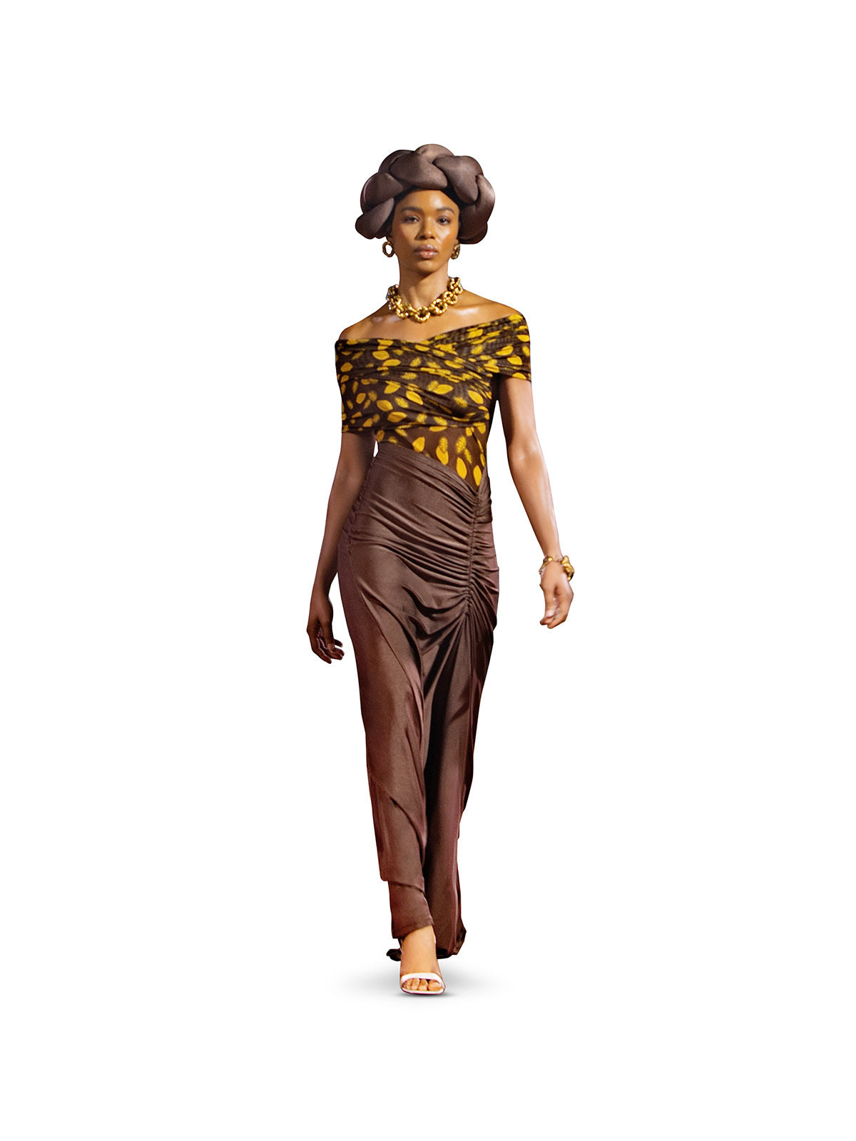A study in graceful architecture, the Cocoa Lycra Dress sculpts and softens in equal measure. The off-shoulder silhouette is defined by a criss-cross shawl drape that folds elegantly across the bust and arms, creating fluid lines that frame the décolletage. The figure-hugging bodice balances its sensuality with refinement, while a sculpted front overlay transitions into a side-draped Lycra skirt that moves effortlessly with the body. The result is a modern expression of timeless femininity. Pair with heeled sandals and gold jewelry for a sleek evening silhouette.