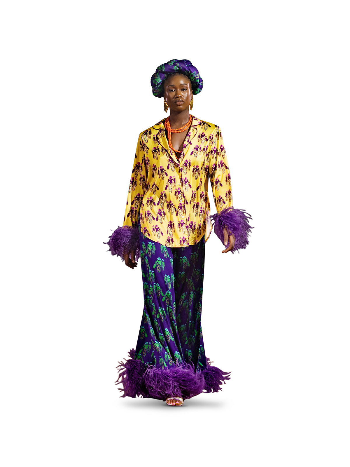 An opulent expression of comfort, the Eedani Set combines luxury craftsmanship with fluid form. The silk top features a loose silhouette, side high-waist slit, and soft ostrich feather cuffs that add movement and texture. Coordinating drawstring trousers echo the same feathered finish along the hem, bringing tactile elegance to a relaxed cut. Rendered in the Dancing Women print, it’s a look that shifts seamlessly from intimate gatherings to elevated leisure. Pair with gold sandals and soft waves for laidback glamour.