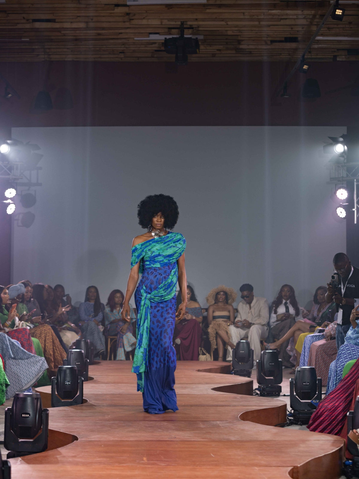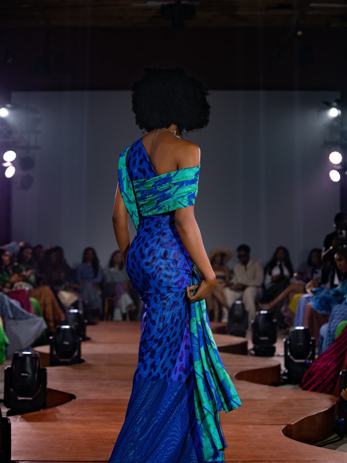 - Asymmetric off-shoulder gown in Cocoa & Fan and Eyo prints