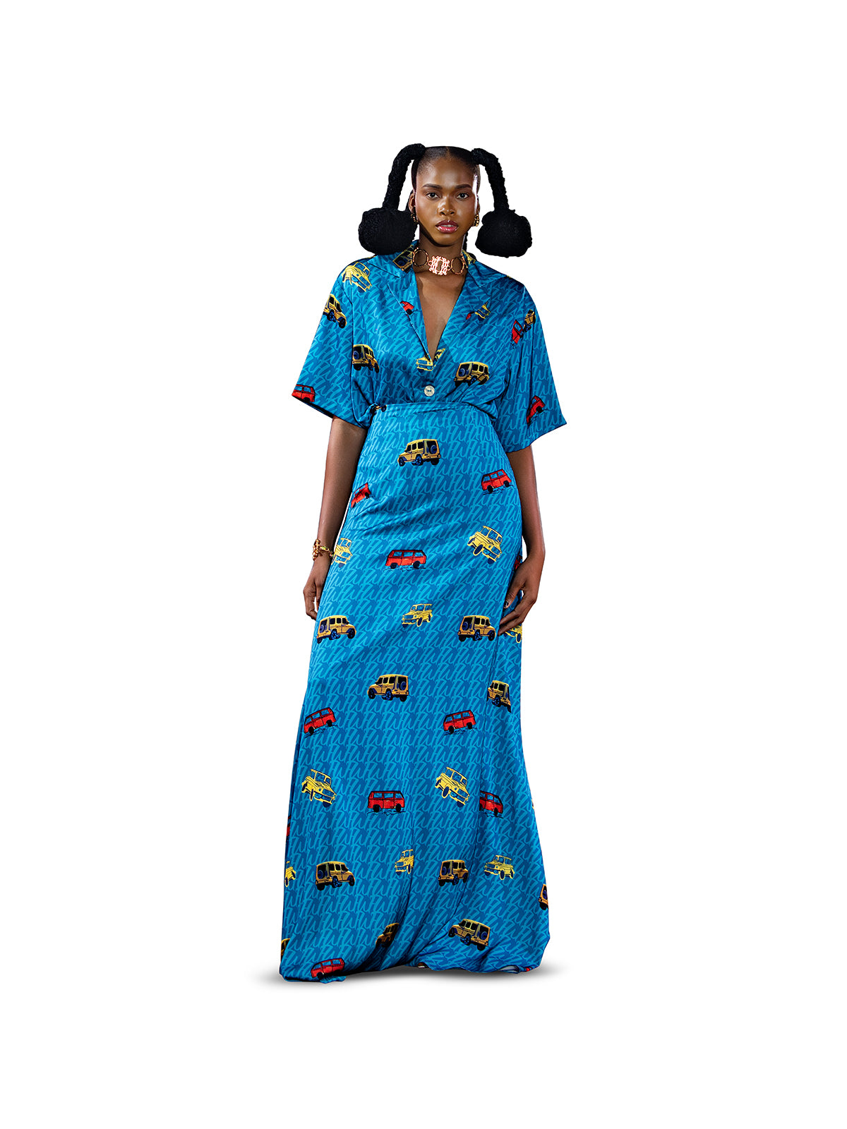 Effortlessly refined, the Irin Ajo Set captures Wanni Fuga’s approach to functional elegance. Crafted in silk acetate, the slightly oversized shirt and A-line skirt are finished in the label’s Calligraphy Buses print — a visual ode to Lagos rhythm and movement. The soft lustre and fluid drape of the fabric elevate its everyday silhouette into a timeless wardrobe statement. Pair with mules and minimalist jewelry for effortless day-to-night refinement.