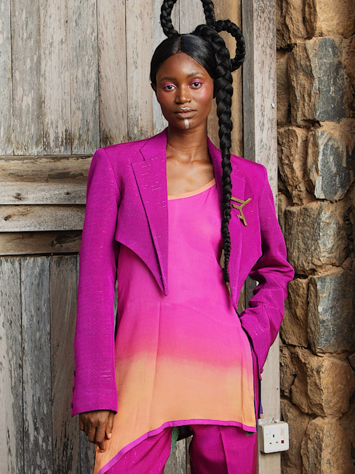 Experimenting with traditional textiles is a key theme in Emmy Kasbit's 'Dawn' collection. Made from panels of hand-woven Akwete cloth in a bold magenta hue, this cropped blazer takes cues from sharp tailoring with structured shoulders and a pointed hem. Style it with a midi skirt or wide-leg pants to add colorful polish to your next big event.