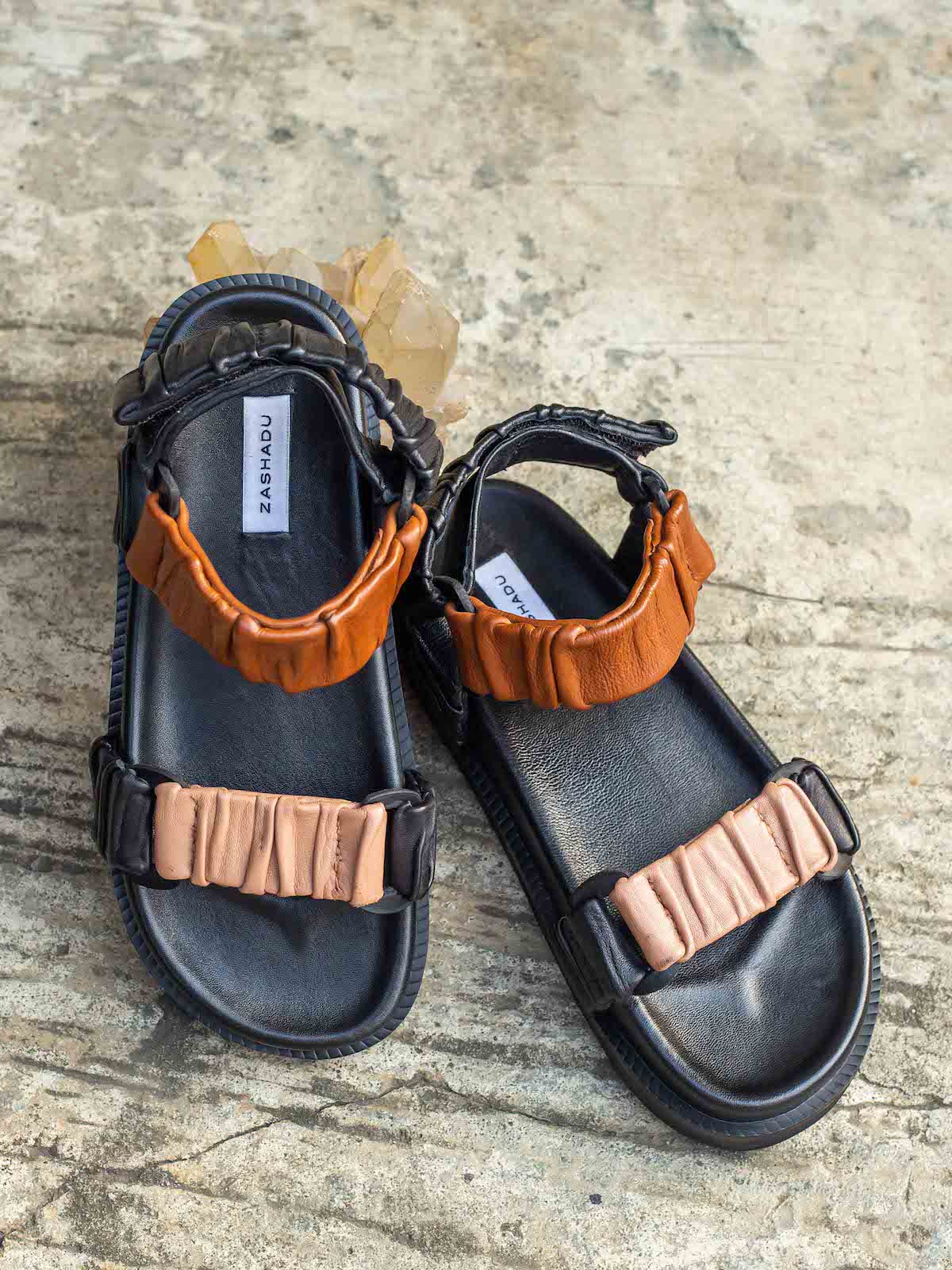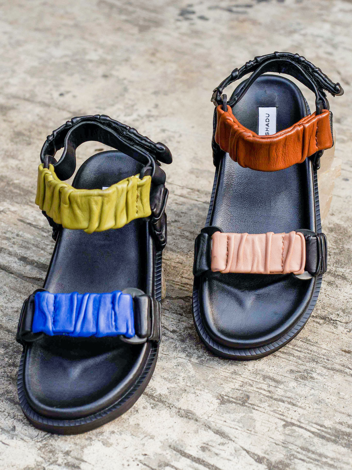 - Open toe, ruched detailing, slingback strap, leather lining and sole