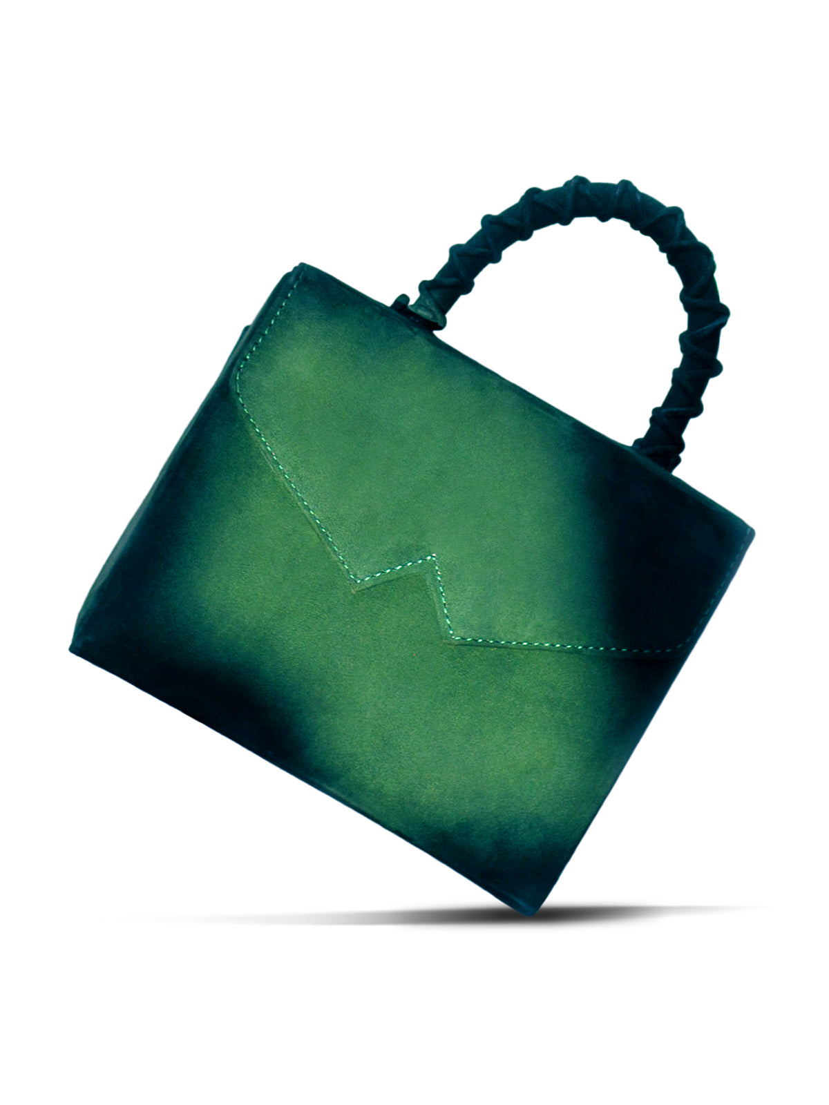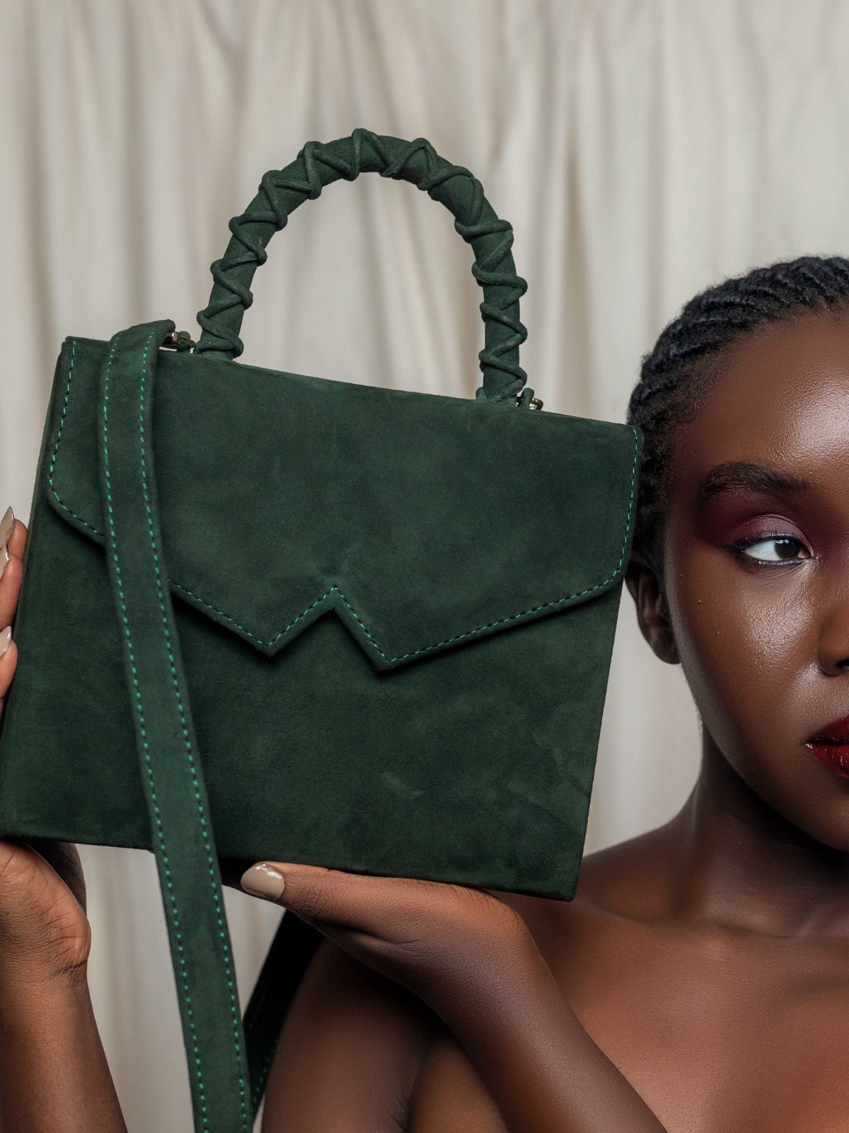 Zashadu’s Bossy Classic Bag takes cues from vintage briefcases, marrying modern elegance with retro accents. Handmade in Lagos from upcycled Sokoto goat suede in statement green, zoom in to appreciate the meticulous stitch detailing that outlines its geometric shape. A bold everyday statement—carry yours by the sculptural top handle or attach the strap for hands-free ease.