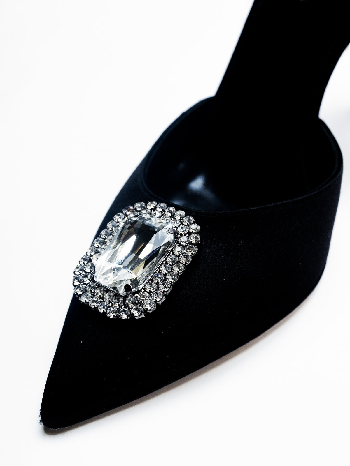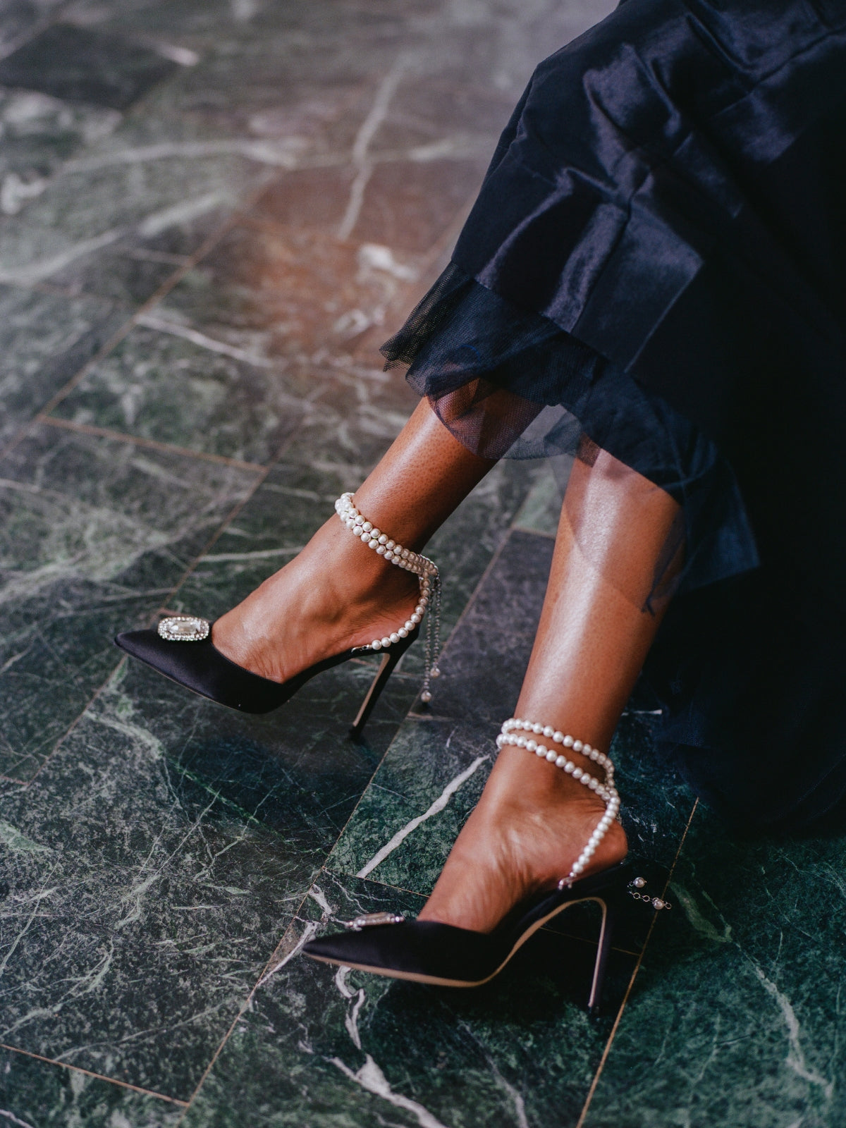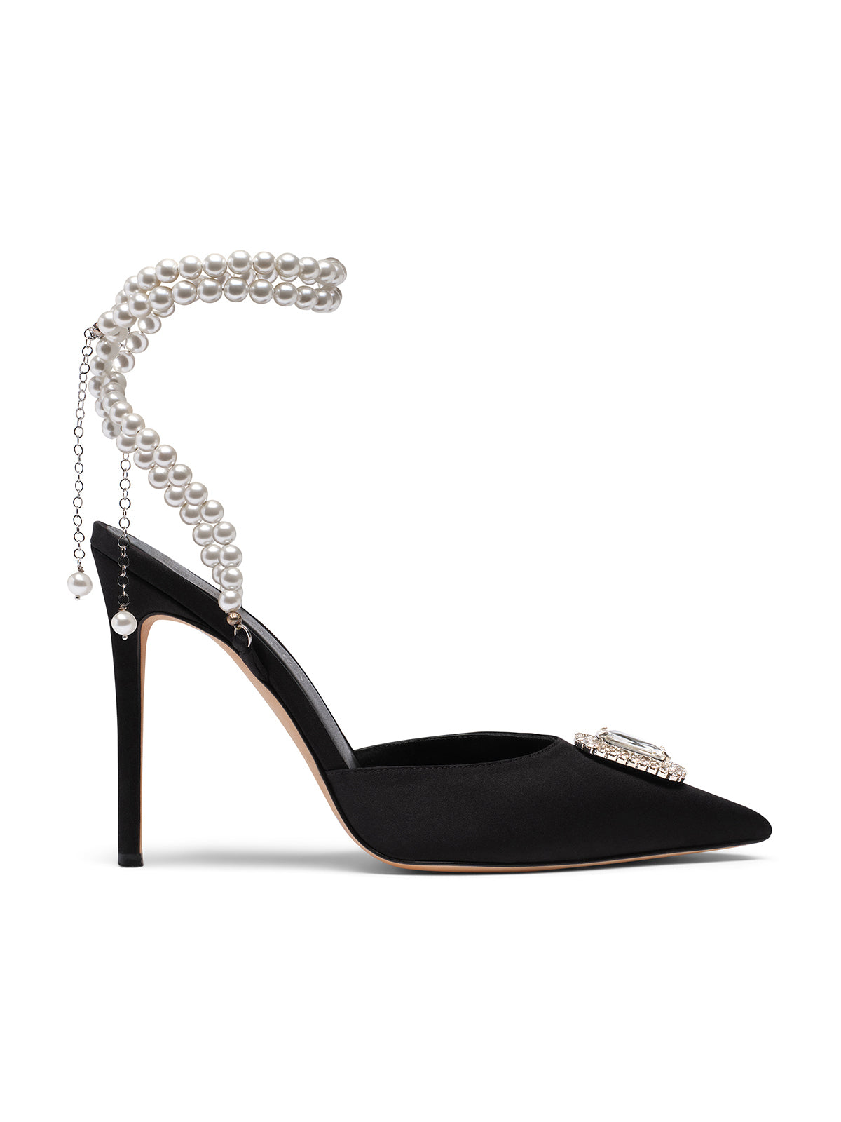 True to their name, Zena Ziora's The Dame Stiletto heels are effortlessly elegant. Masterfully handcrafted in Italy, the pointed-toe silhouette is made from silk satin and detailed with a diamanté crystal embellishment that catches the light from every angle. The label’s signature Spanish Maiorca pearl strap wraps neatly around the ankle, while the stiletto heel adds timeless appeal. Wear them to elevate evening looks.